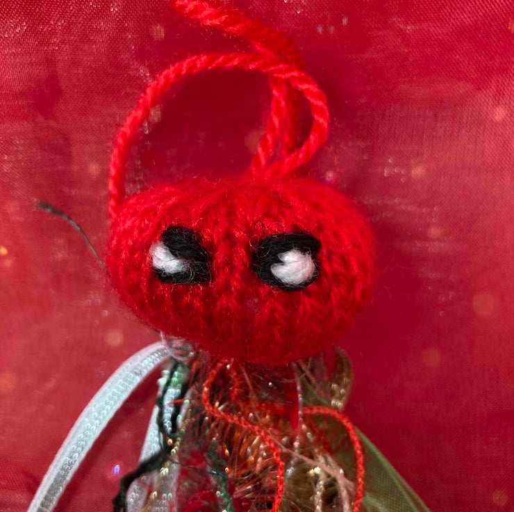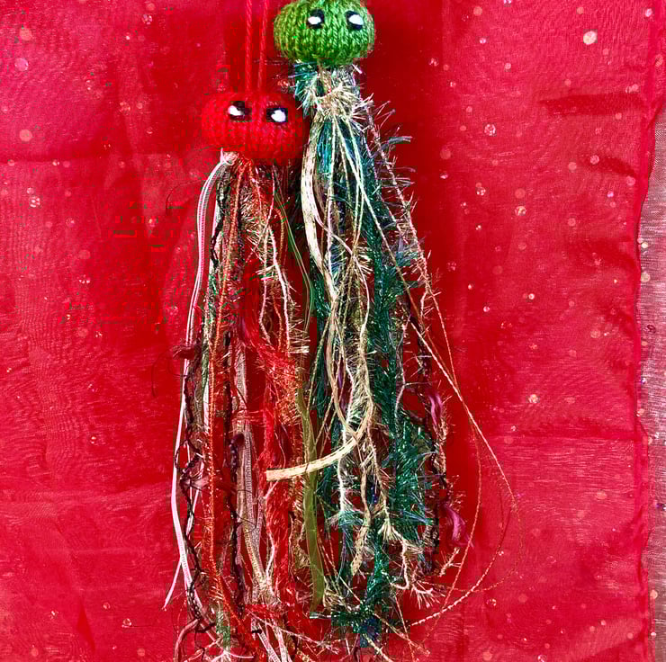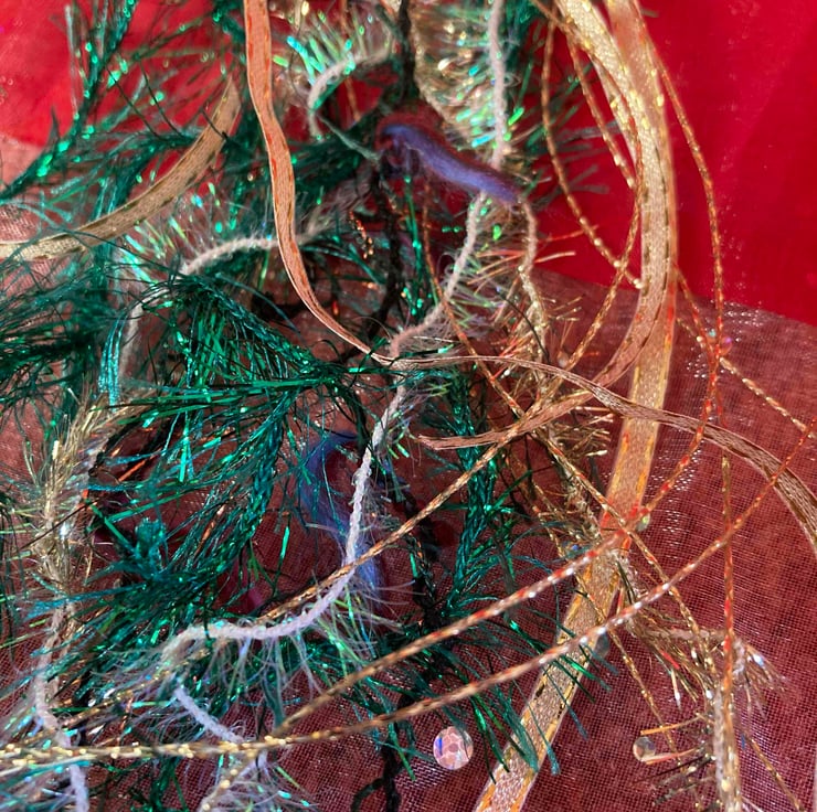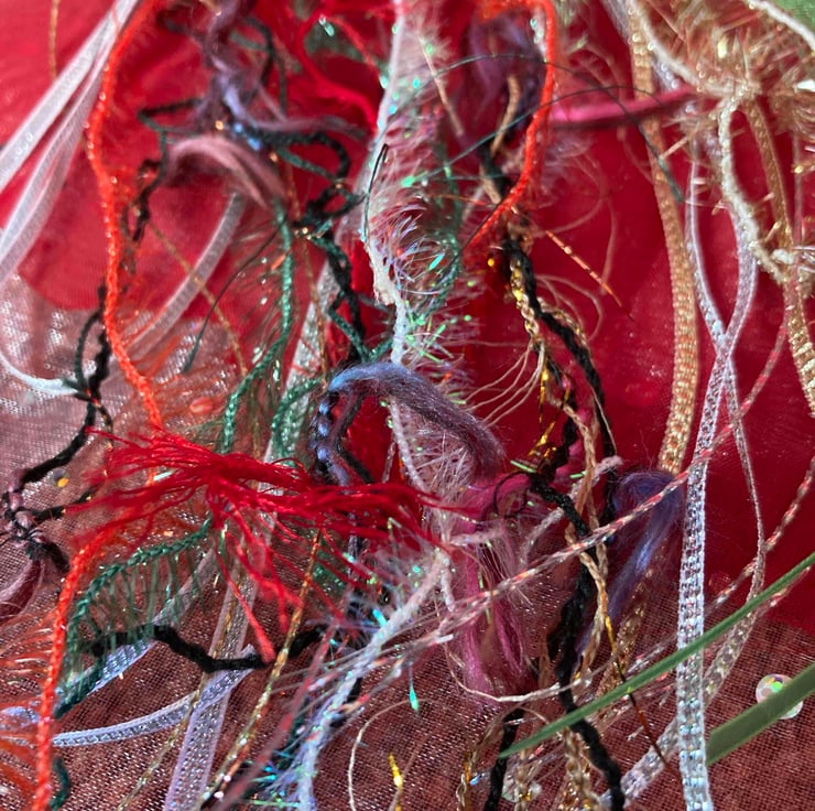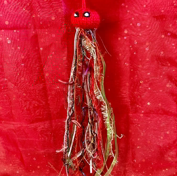 Red jellyfish has trails of yarn, ribbon and braid in green,silver, gold, red and black.