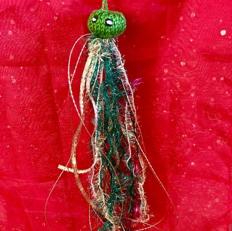 The green jellyfish has trails of yarn, braid and ribbon in silver, green, gold and black