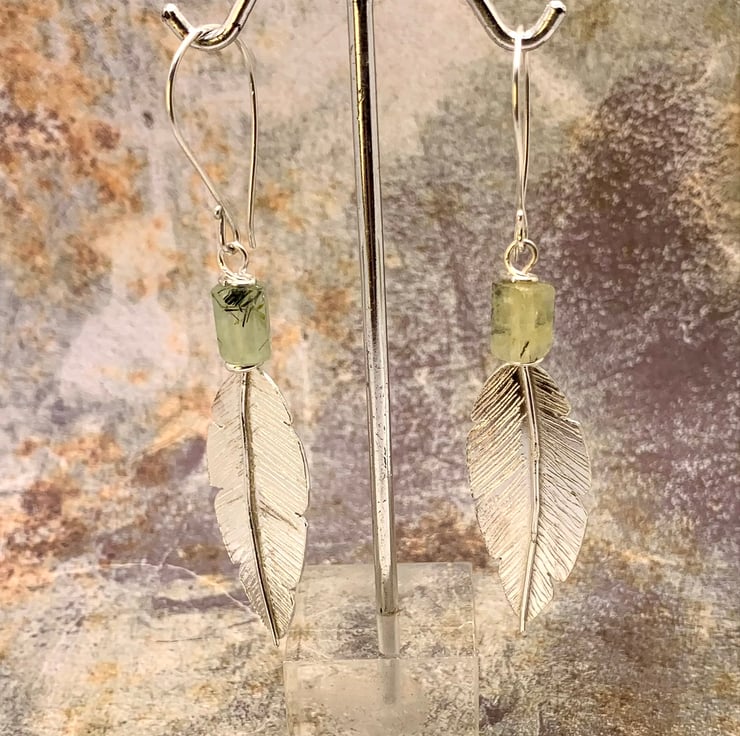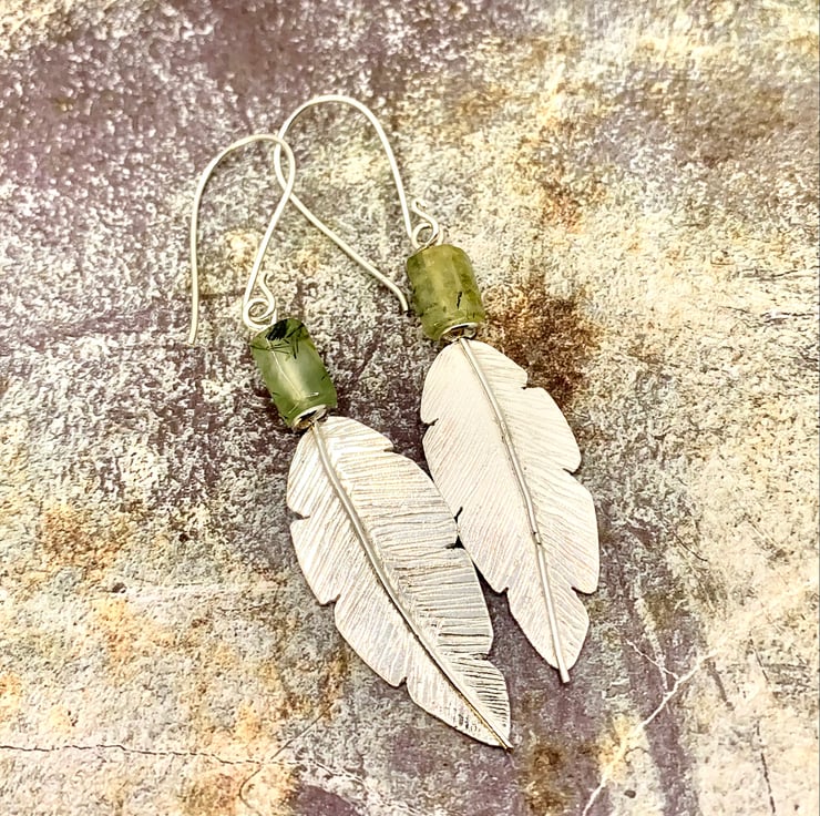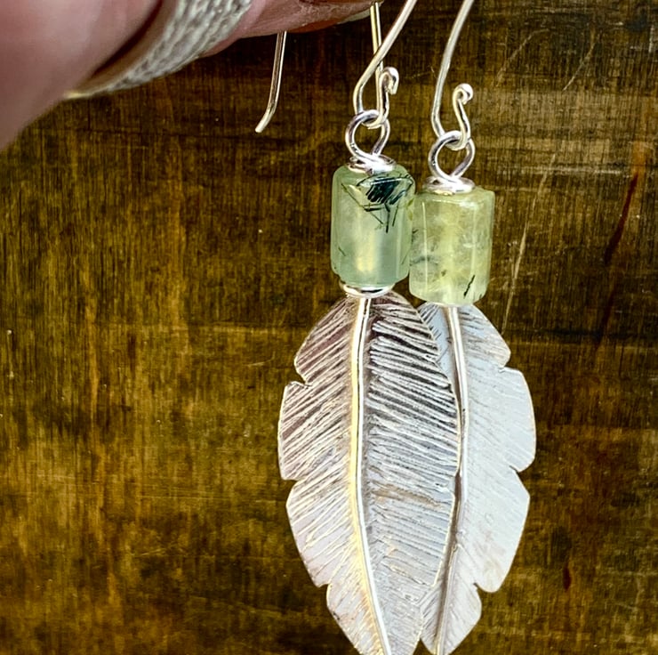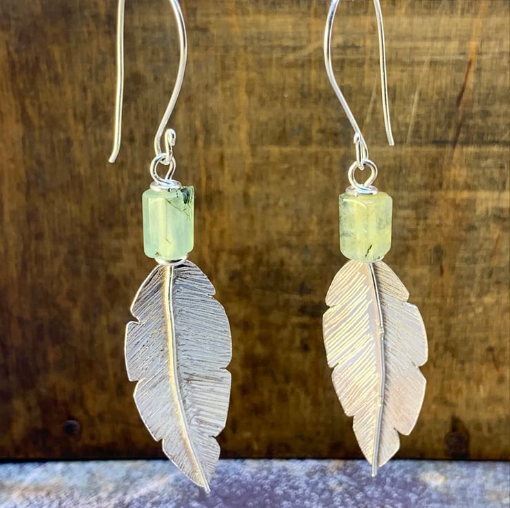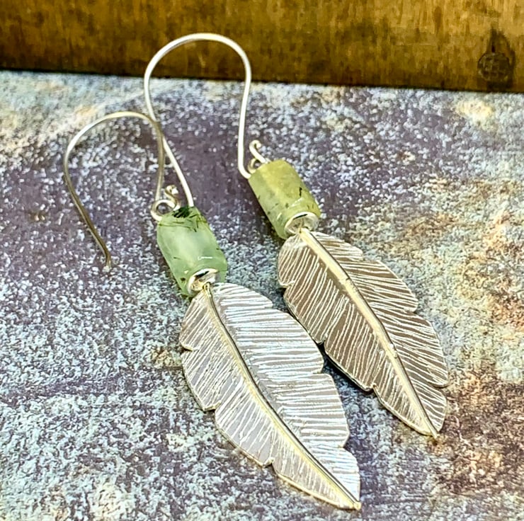 These feather earrings have been handmade using traditional methods. They have been hand-cut from sheet silver with a very fine saw blade, and the feather detail has been engraved by hand, making each one unique. A lovely Prehnite Barrel Gemstone bead has been added to finish the earrings.