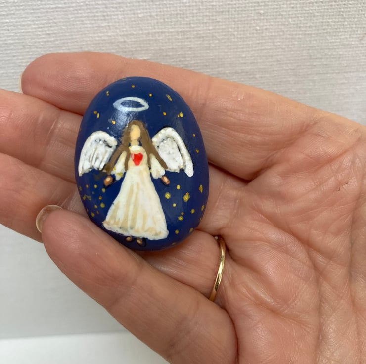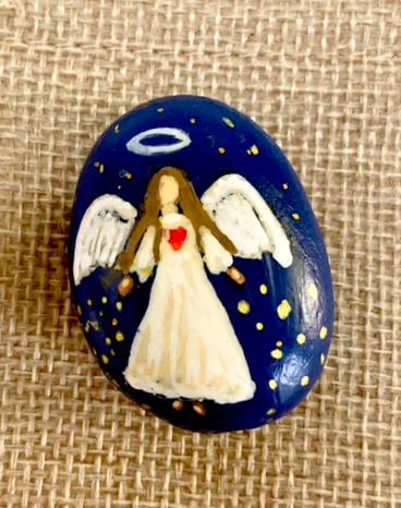 Hand painted onto a natural small stone, this sweet angel is here for you.
