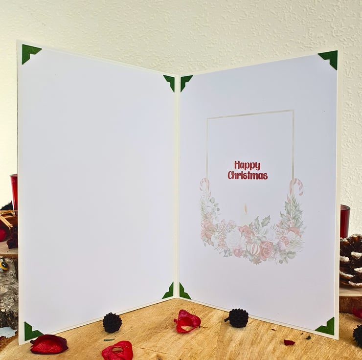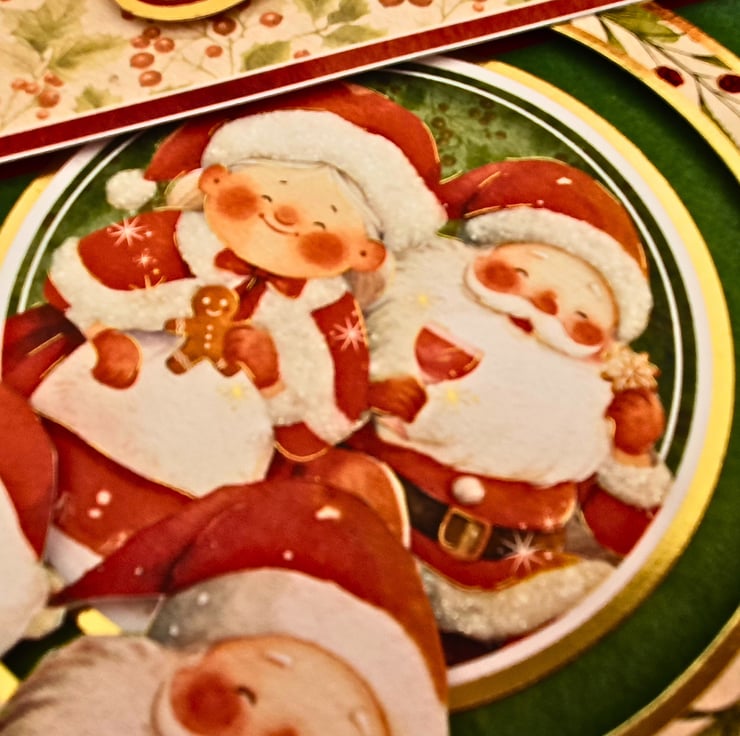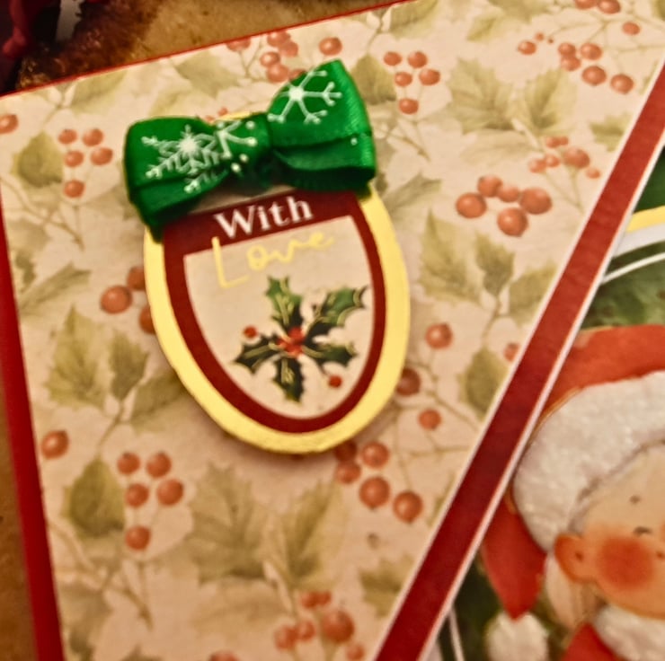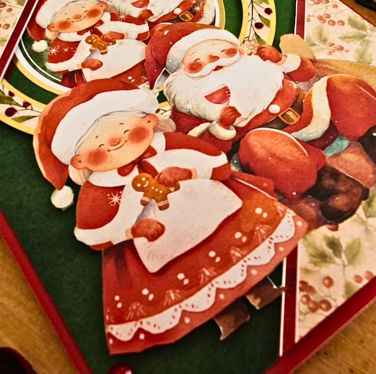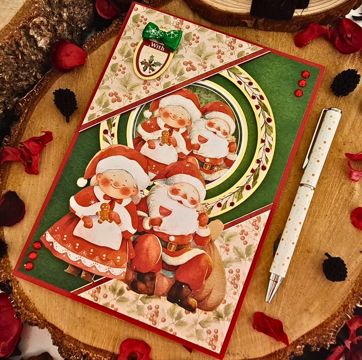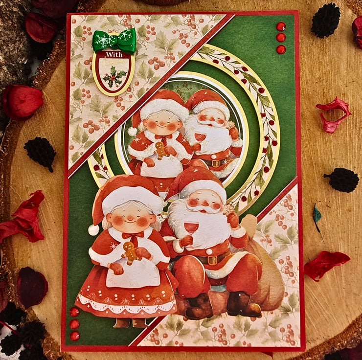 The card consists of mats of red & green card, layered with two diagonal panels, printed with Hollies & red berries. In the middle, the gold foiled topper with Father Christmas & Mrs Christmas is surrounded by a matching frame. The sentiment tag reads "With Love" and is embellished with a green Christmas bow. The card is adorned with red & white glitter accents, & red diamante. It is finished with coordinating inserts, stamped with the message "Happy Christmas" in red. It is bordered with matching, decorative photo corners.