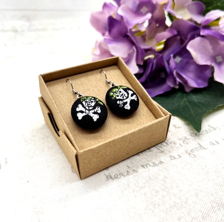 They come in an eco-friendly kraft card square earring box with logo – perfect for gifting to that fan of pirates, skulls and skull and crossbones.