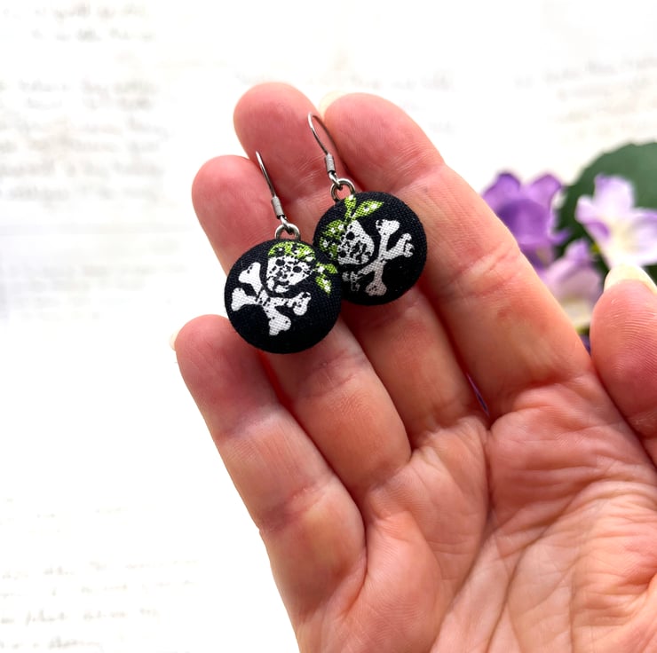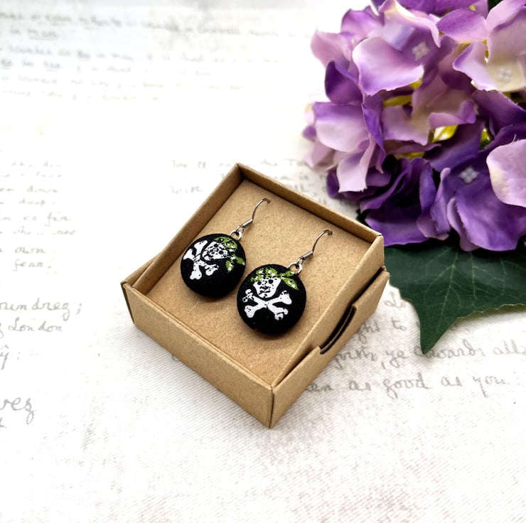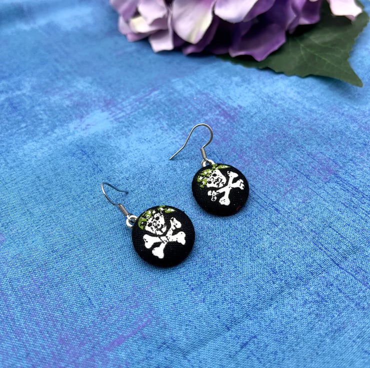 There’s no ‘walking the plank’ when you’re wearing these fabric button earrings, featuring a white ‘distressed look’ smiling skull and crossbones sporting a green bandana on a black background.