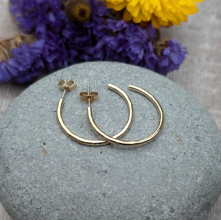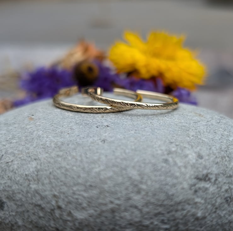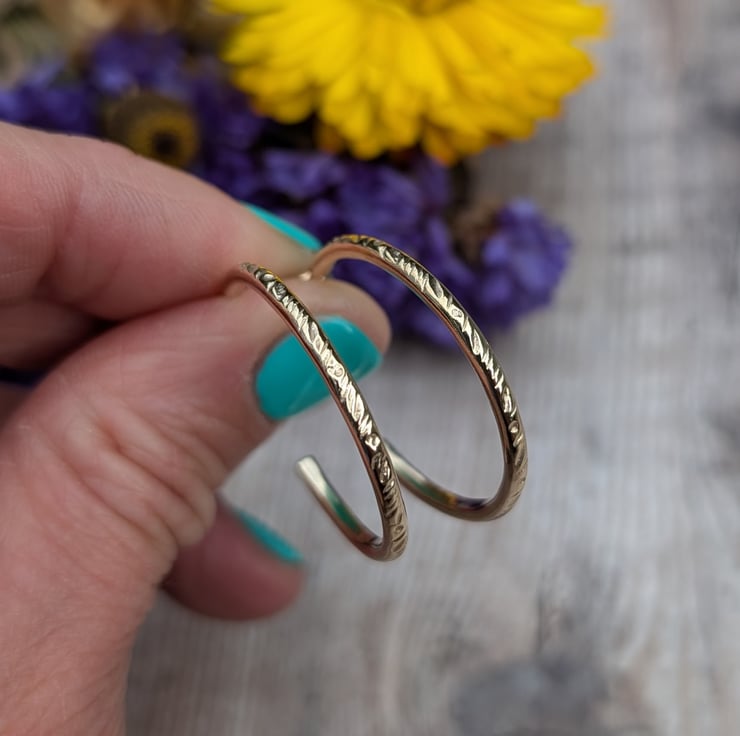 Crafted from 2mm thick recycled 9ct gold wire, these handmade hoops are a celebration of nature’s beauty. The delicate 'Meadow' pattern, impressed by hand, brings a touch of organic elegance to the classic hoop design. Each piece is hallmarked by the London Assay Office, ensuring quality and authenticity. These hoops are perfect for those who appreciate timeless, sustainable jewelry with a unique, artisanal touch.