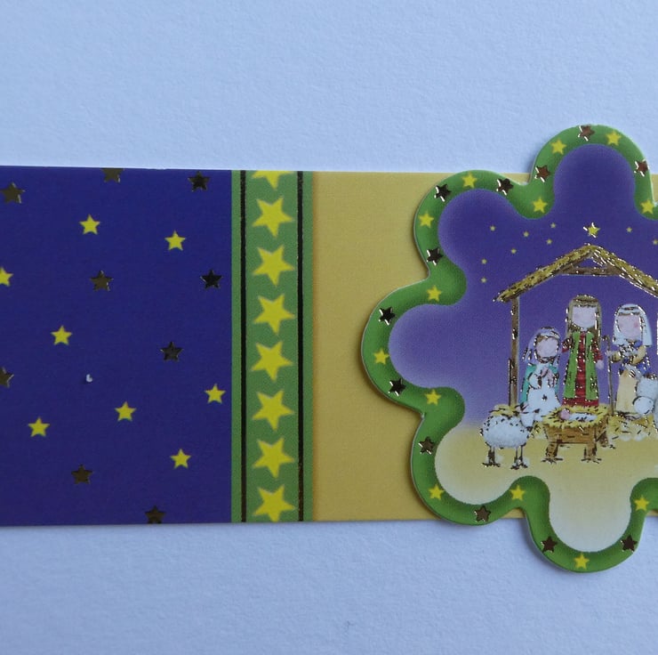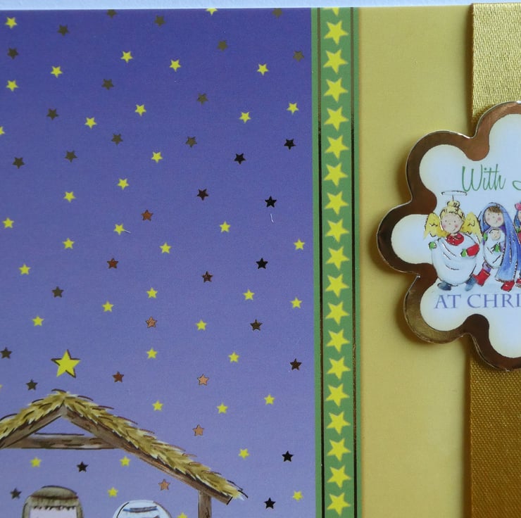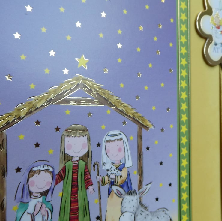 The front of the card has an image printed onto quality gloss card depicting the Nativity scene against a starry night sky. Some of the stars and other details have been highlighted with metalic gold foil.