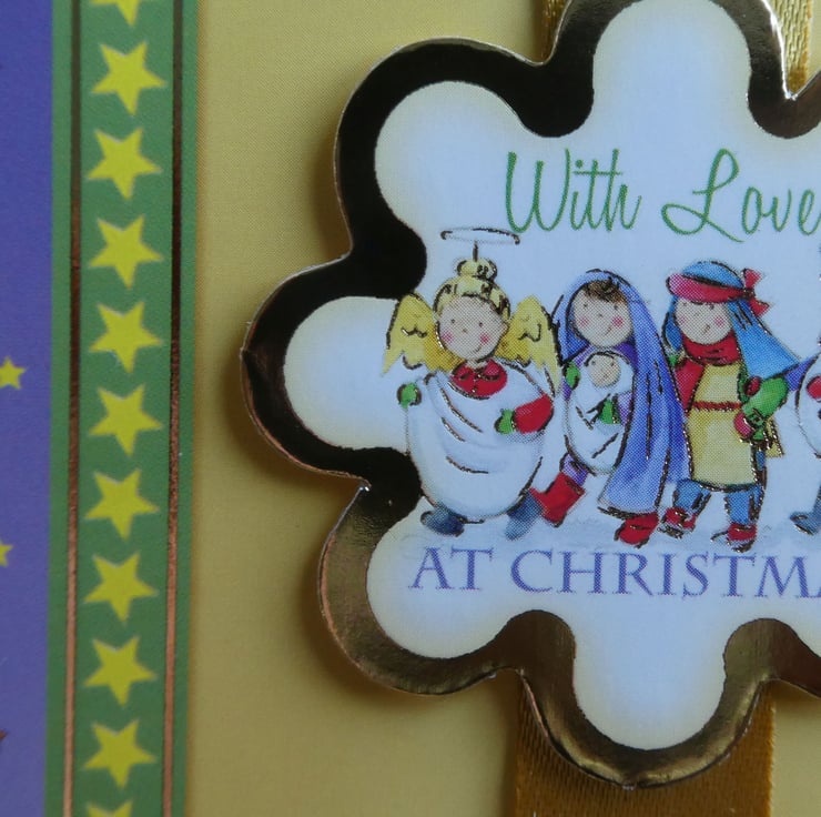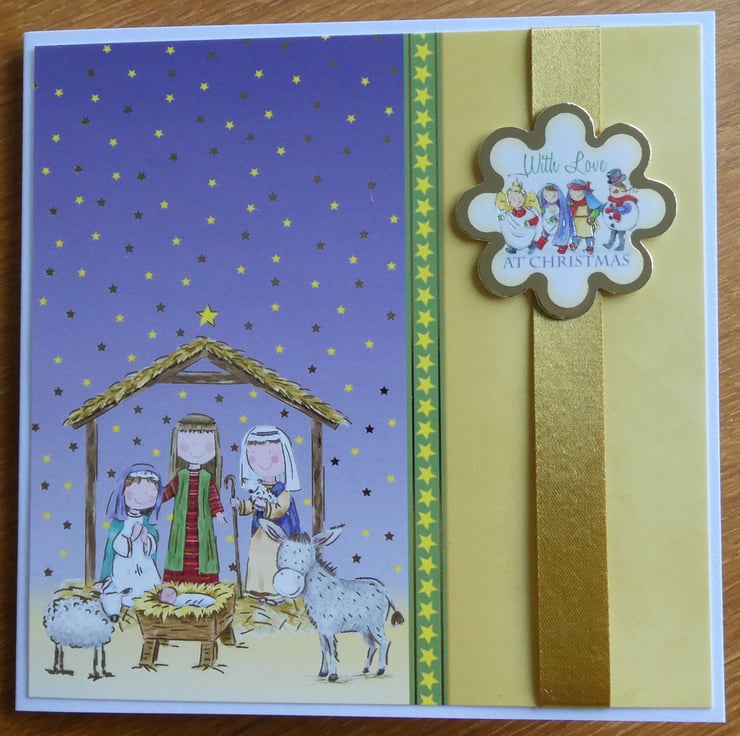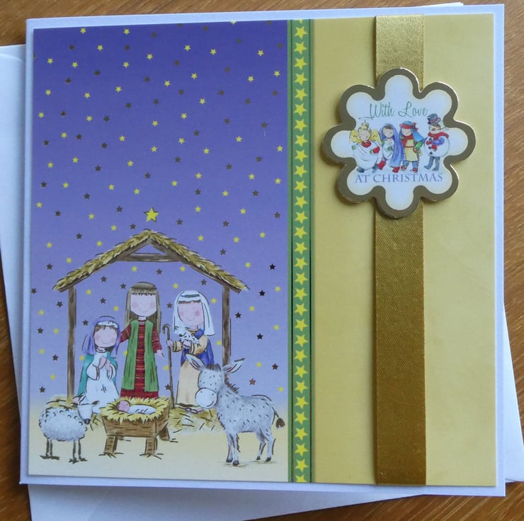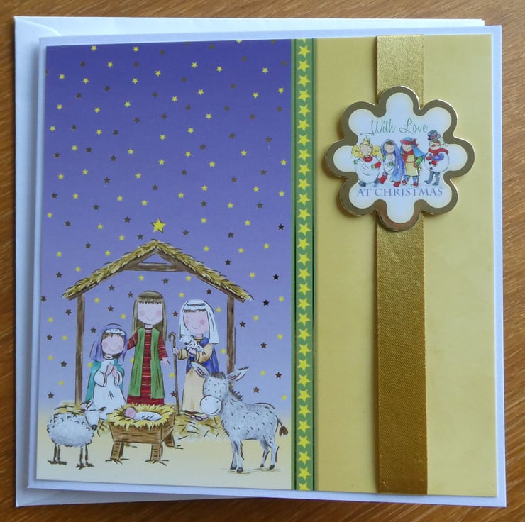 This Christmas card has a Nativity scene and the message With Love At Christmas.