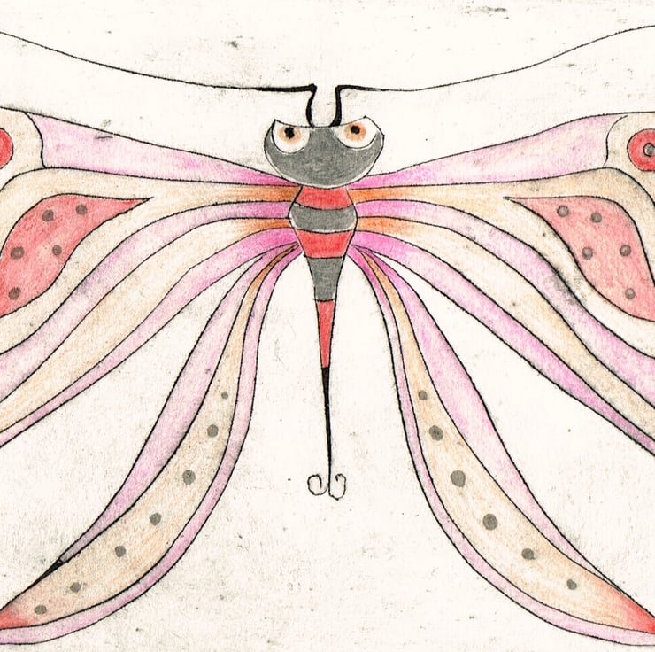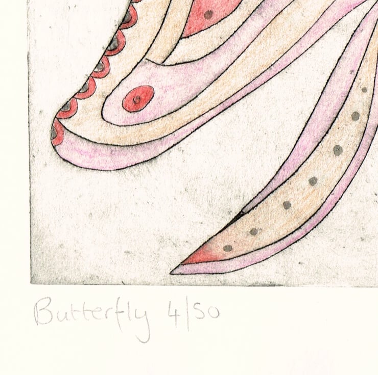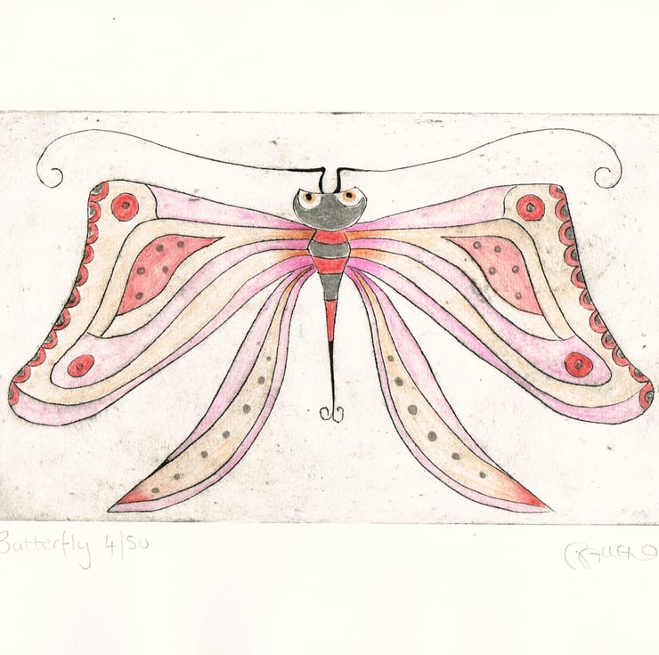 I love creating weird and wonderful creatures, this print is titled ' Butterfly '. This is a dry point etching print. Its is printed on thick, slightly cream watercolour paper and is approx. 29.5cm x 21cm and the etched area is 21.5cm x 13cm. The print is print in black ink and its been hand coloured with watercolour. Its a limited edition and its a small print run of 50 and this is no.4/50