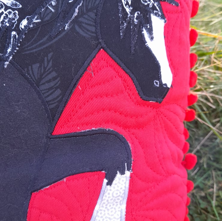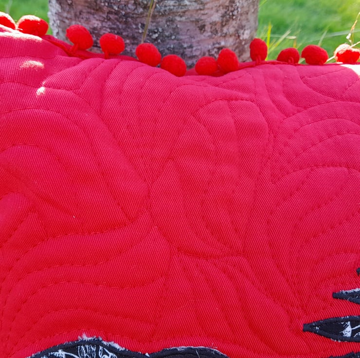The design is shown off perfectly by the vibrant red background which has been free motion quilted with a delicate pattern, stitched in a darker shade of red. This creates a subtle yet intricate texture and gives it a luxurious feel.