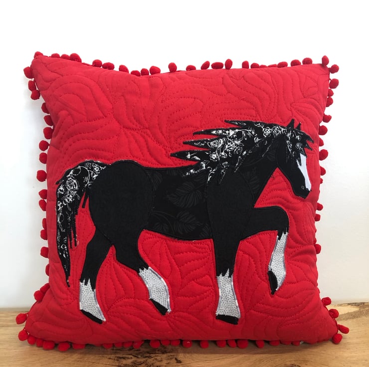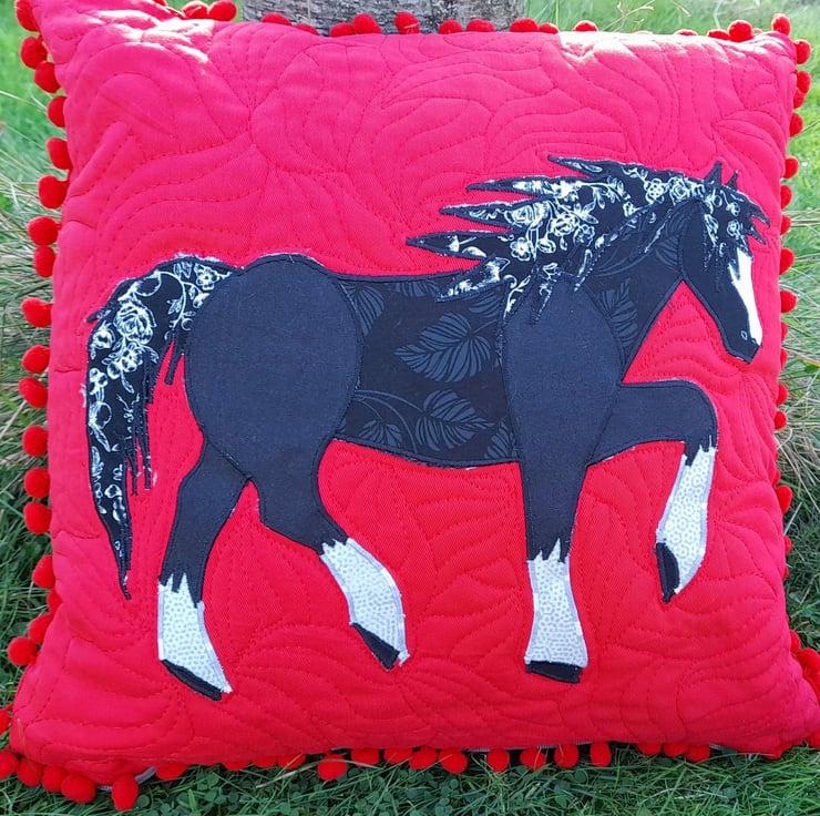 This cushion has a unique applique 'Gypsy Cob' design. The applique has been created from various fabrics both patterned and plain to accentuate the silhouette of the horse and show off the white feathers and blaze.