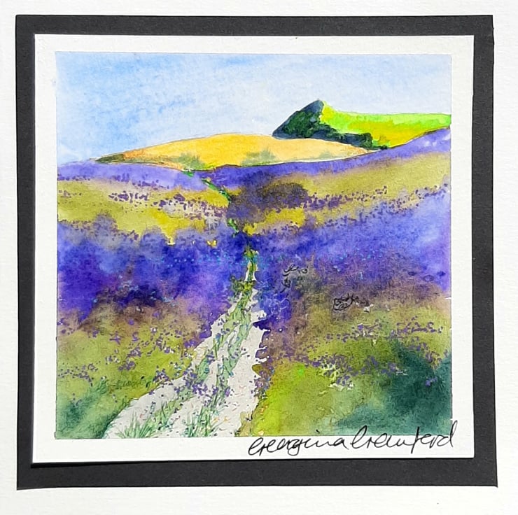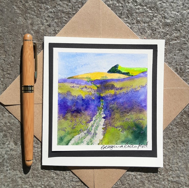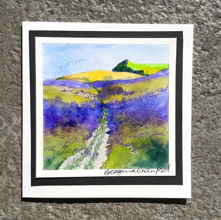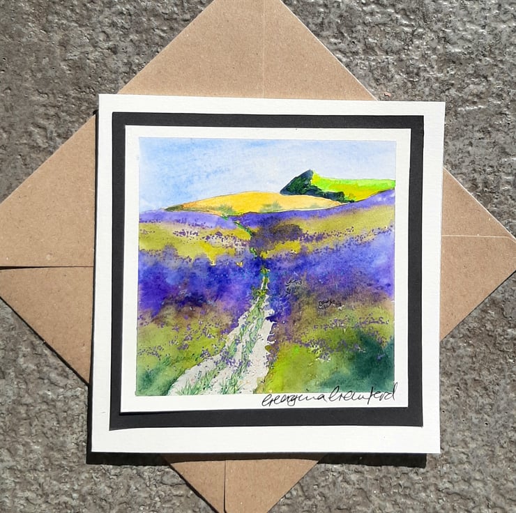 Beautiful handpainted watercolour card of hillsides filled with heather.
