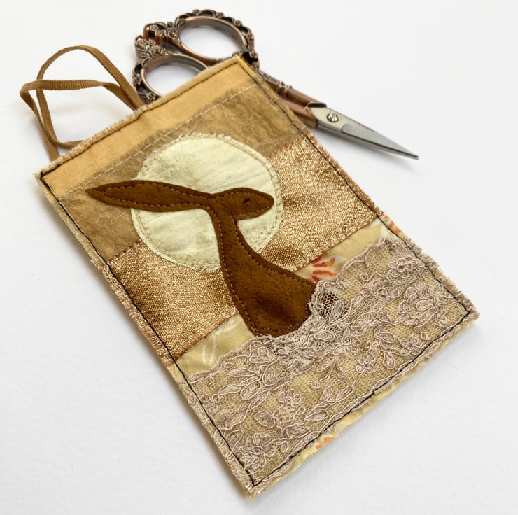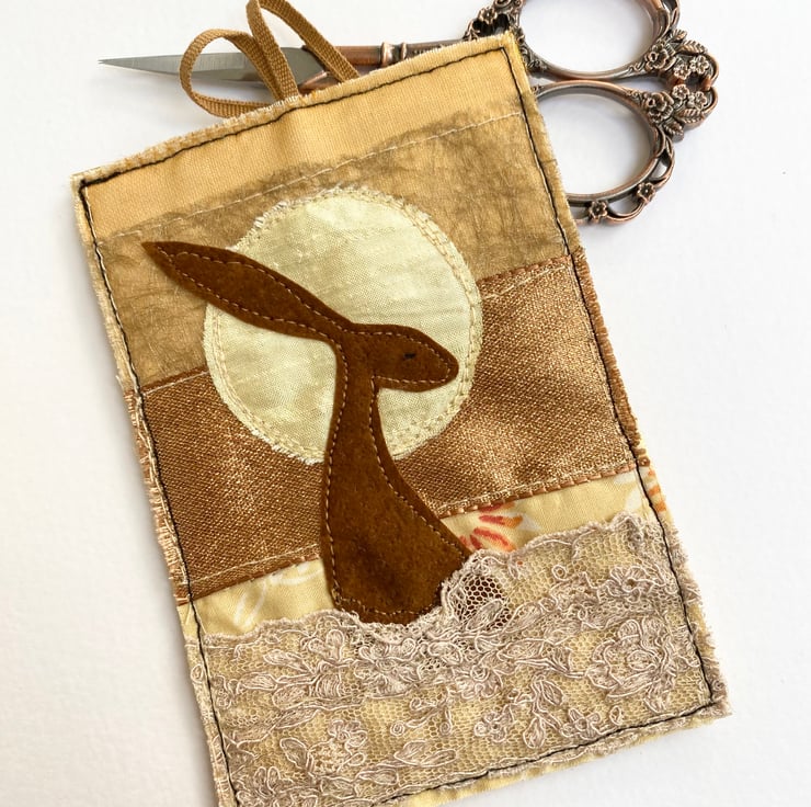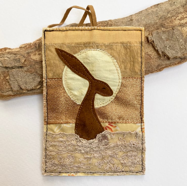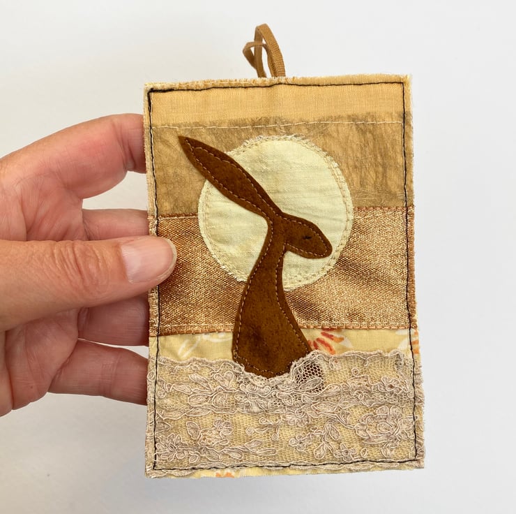 This charming embroidered hare home decorations shows a hare framed by a setting harvest sun. It has been made from up-cycled fabrics and stitched down with free motion embroidery. It comes felt backed and measure approx 12.5 x 8.5cm, with the ribbon the length is 26cm.