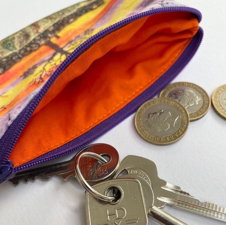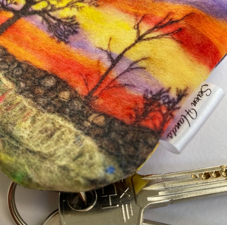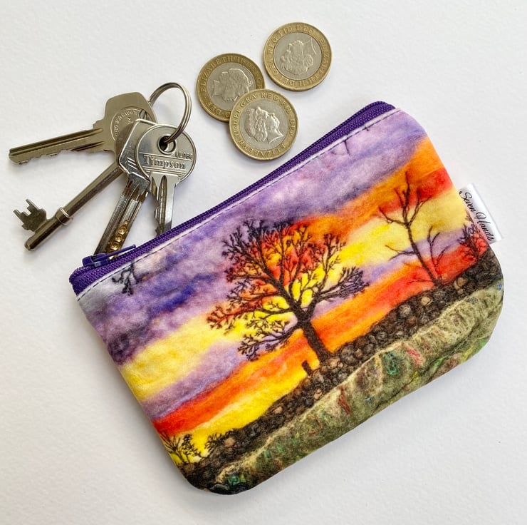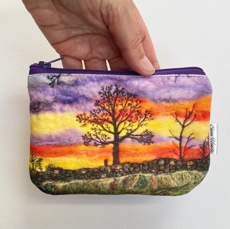 This highly versatile gorgeous zip bag is decorated with a print of one of my felted landscapes on. This one shows tree silhouettes set against a stunning sunset. It’s lined with a cotton lining and has a matching coloured zip. The print is on the front and back.