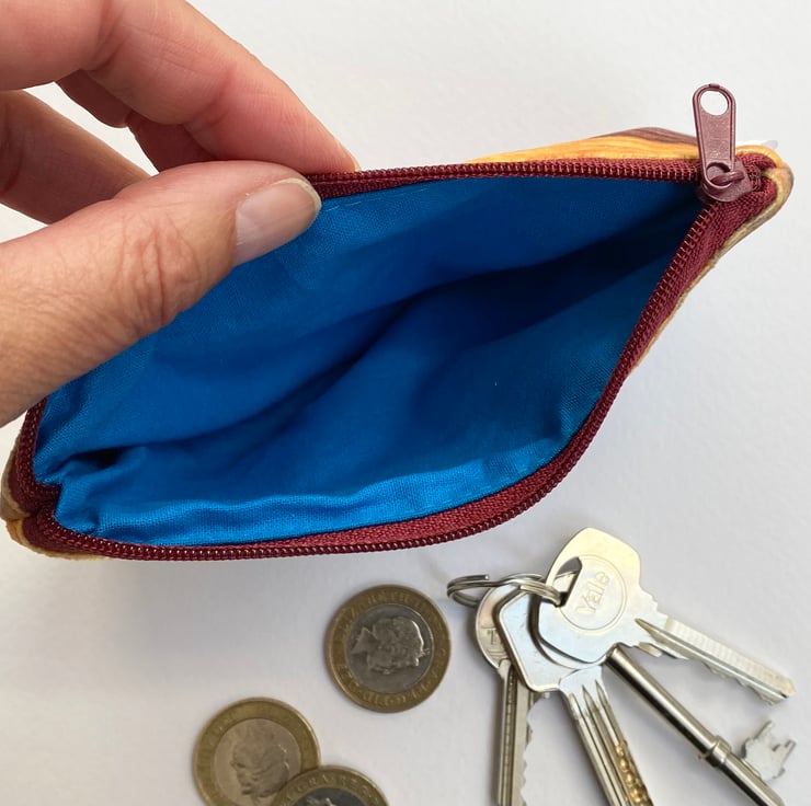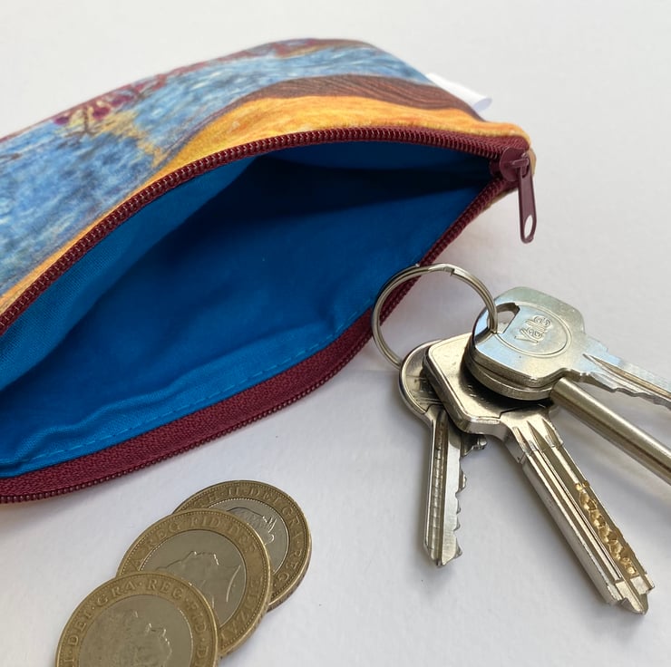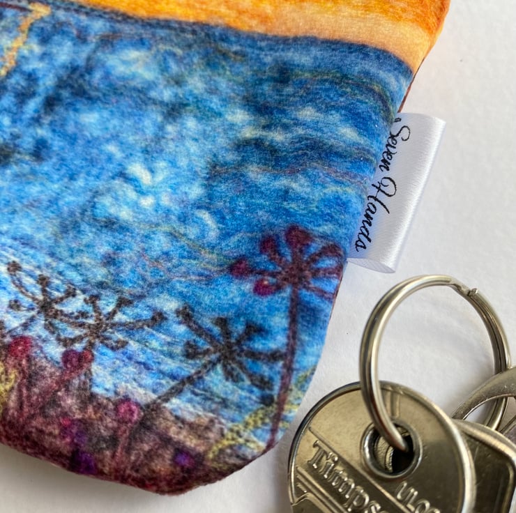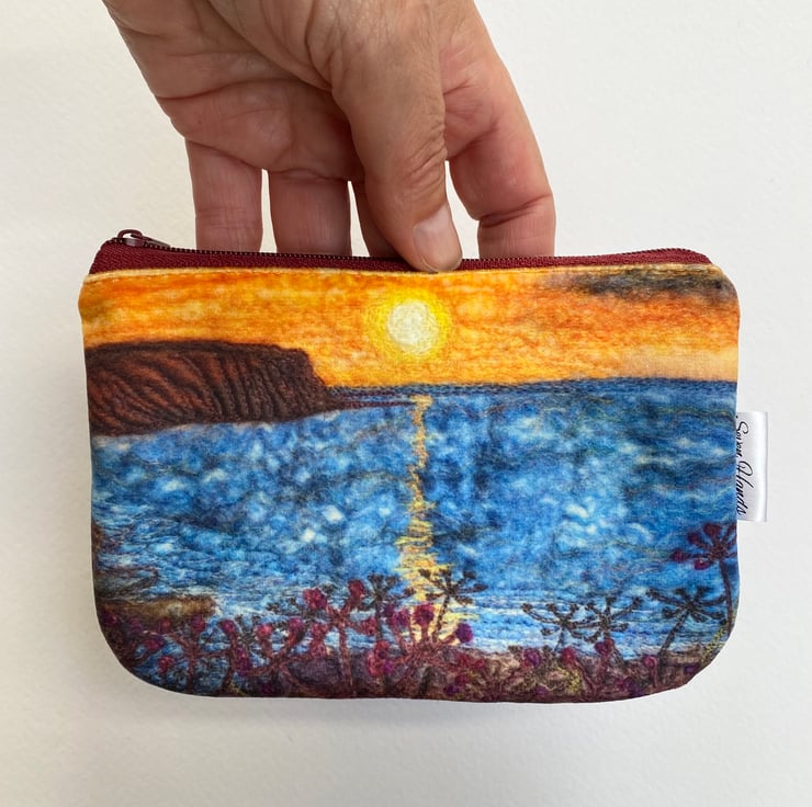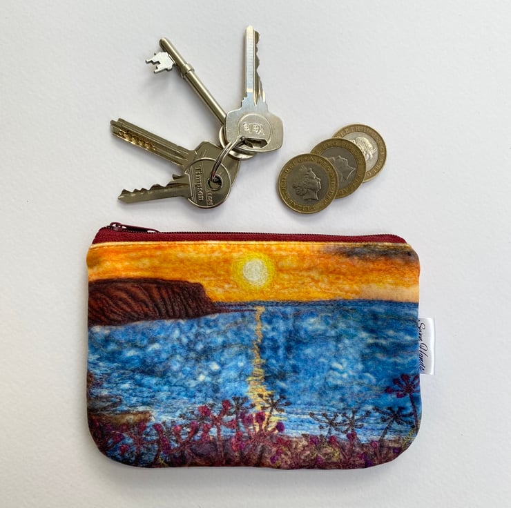 This highly versatile gorgeous zip bag is decorated with a print of one of my felted seascapes on. This one shows a stunning sunset over Whitby beach through the banking. It’s lined with a cotton lining and has various matching coloured zips. The print is on the front and back.