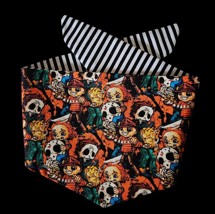 With a collage of your favourite slasher villains, this horror film-inspired bandana is backed with a cool looking black and white striped fabric, perfect for Halloween night walks or horror-loving pet parents.