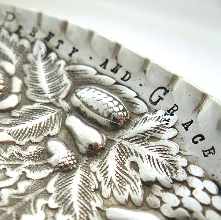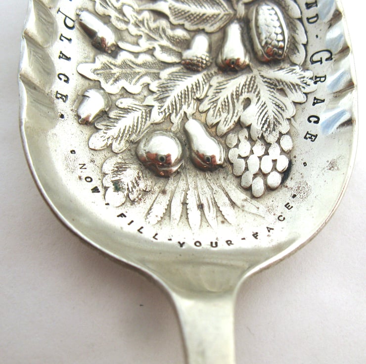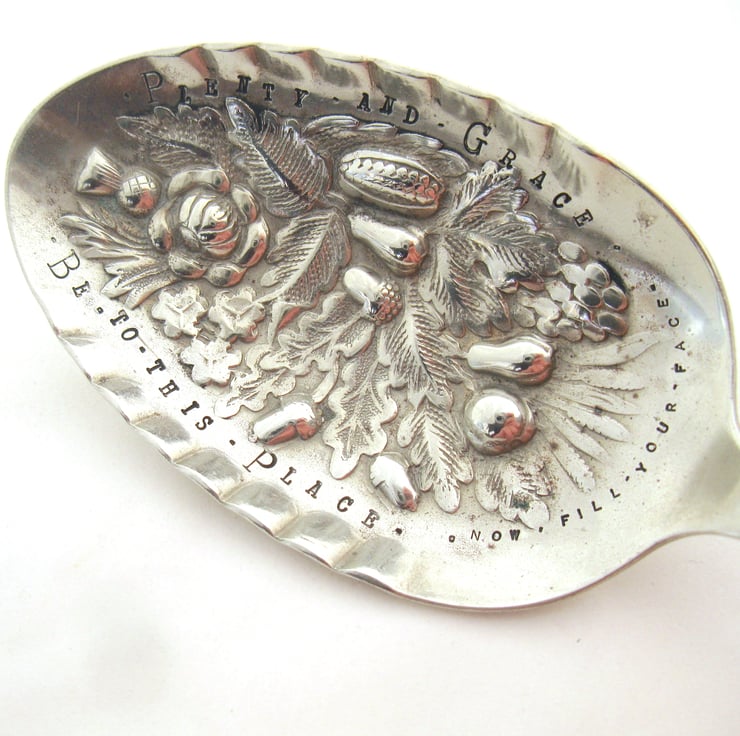 A vintage fruit pattern embossed 'berry' spoon that I've handstamped around the edge: