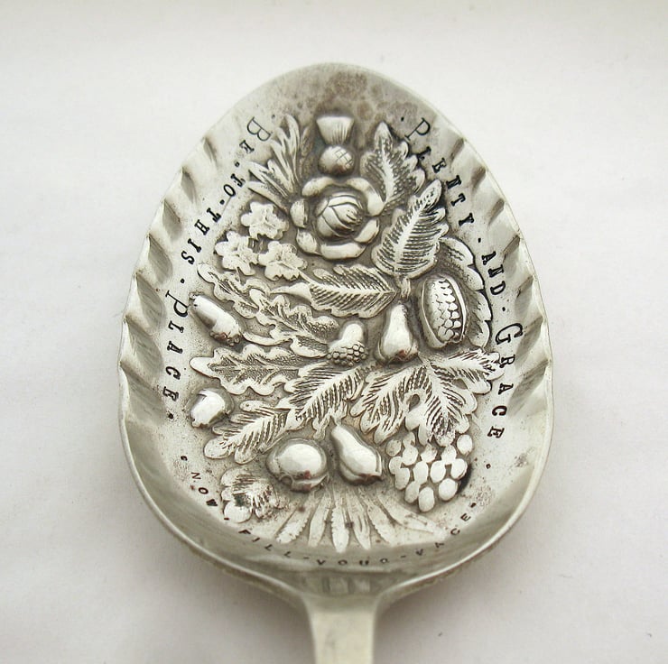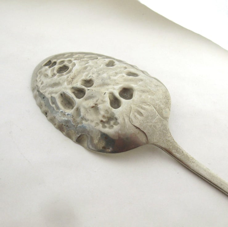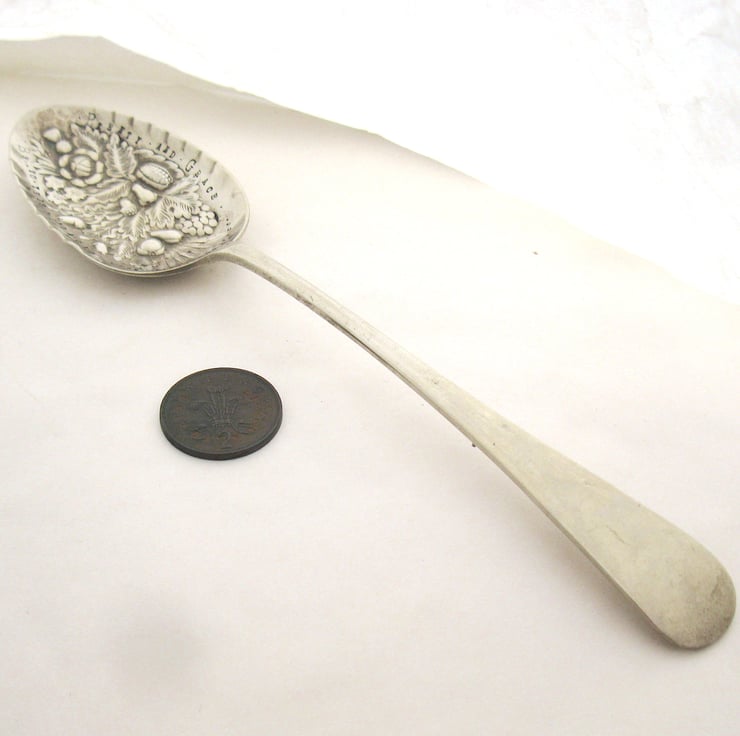 You will receive the spoon shown in the photographs. Please note that it is a vintage or indeed an antique item, I would guess Victorian, so it has quite a lot of wear to the raised parts of the design, there is some residual tarnish and there are considerable scuffs and wear marks, particularly on the back of the handle. This may not bother you but I think it's worth pointing out at this stage so that you (or whoever you give this to) won't be disappointed. This is a spoon with heaps of vintage character, rather than a mirror-finished brand-new-looking one.