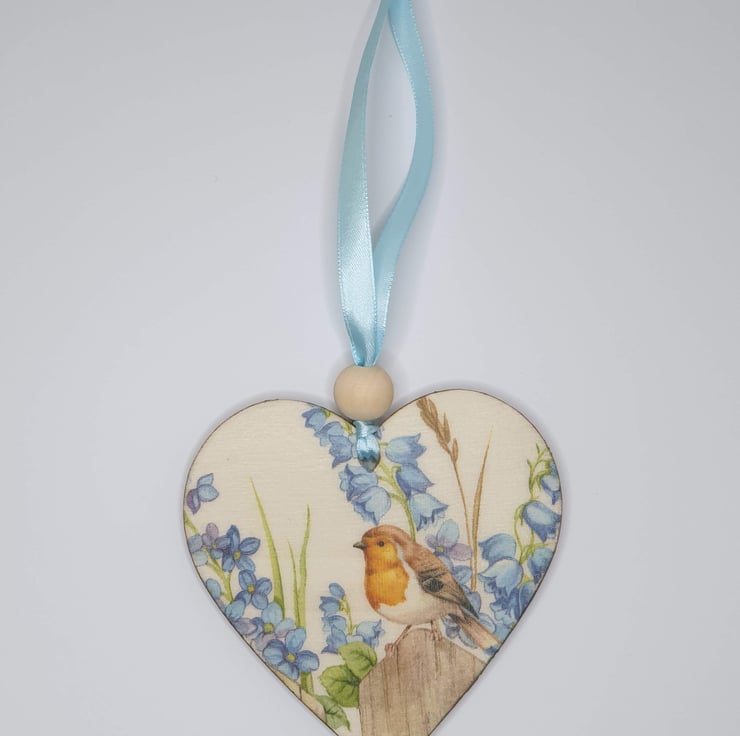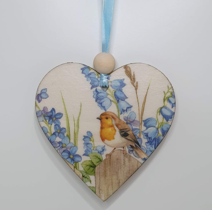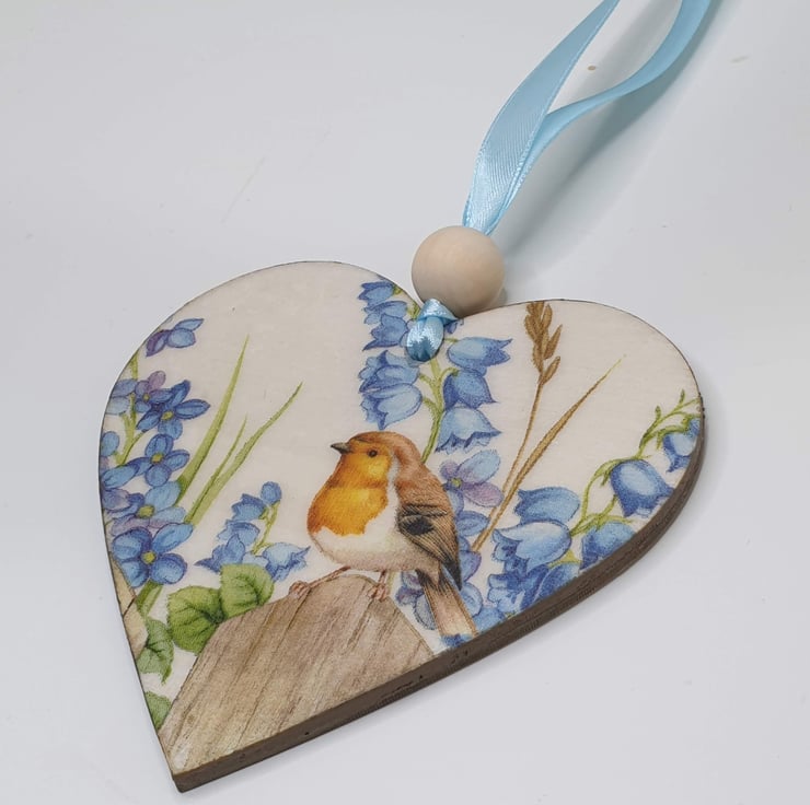 Robin wooden hanging heart decoration. The heart has been decoupaged with a pretty robin design on the front, sealed and finished with pale blue satin ribbon and a wooden bead ready to hang.