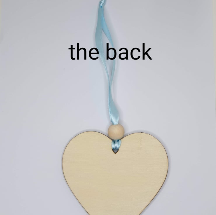 Size of wooden heart without ribbon and bead: 10 cm x 10 cm at widest points and 0.5 cm thickness approx