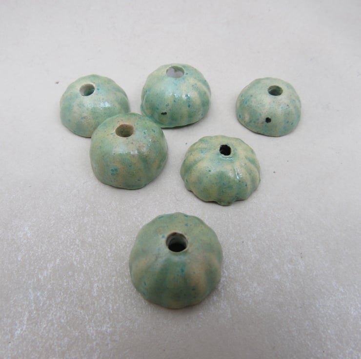 6 Small Verdigris Green Half-round Ceramic Flower Beads