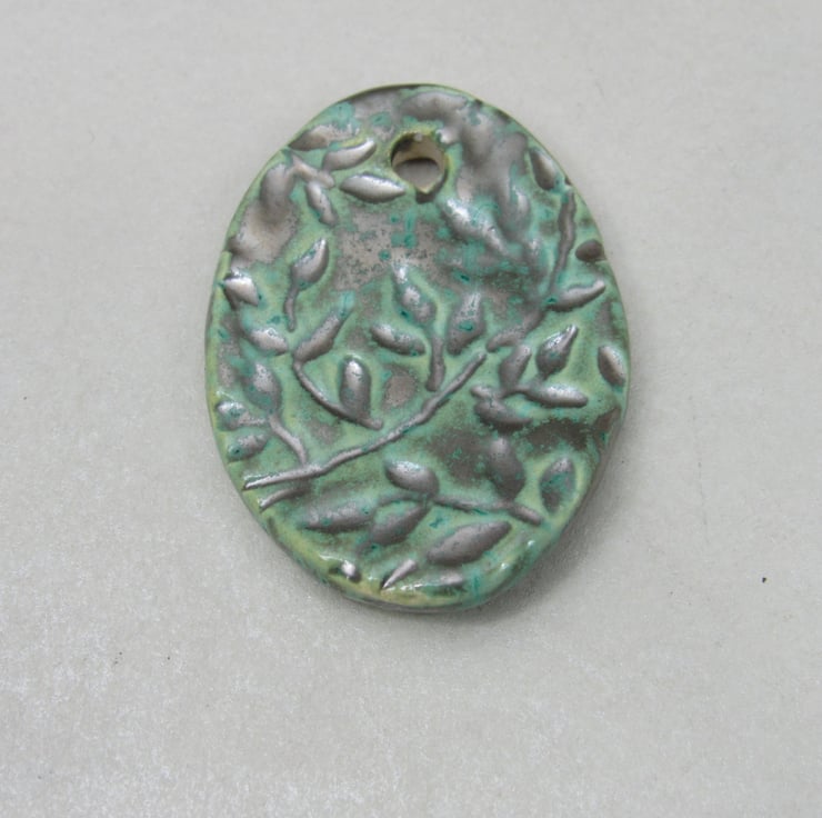 Large Verdigris Leaf Sprig Handmade Ceramic Pendant