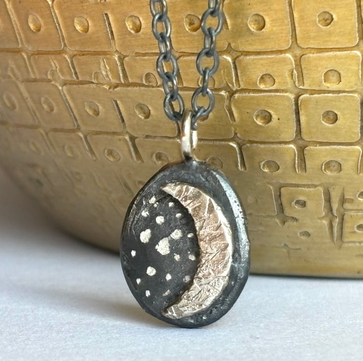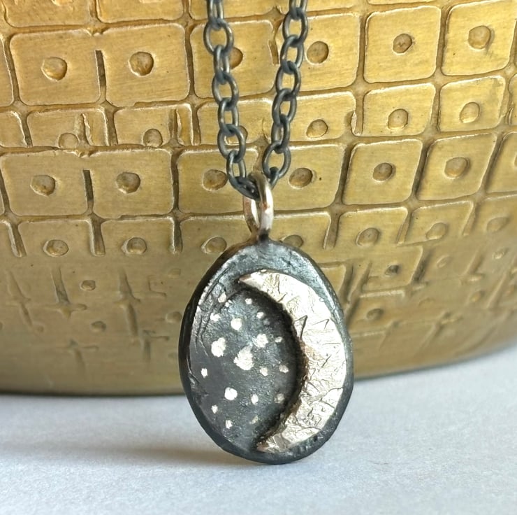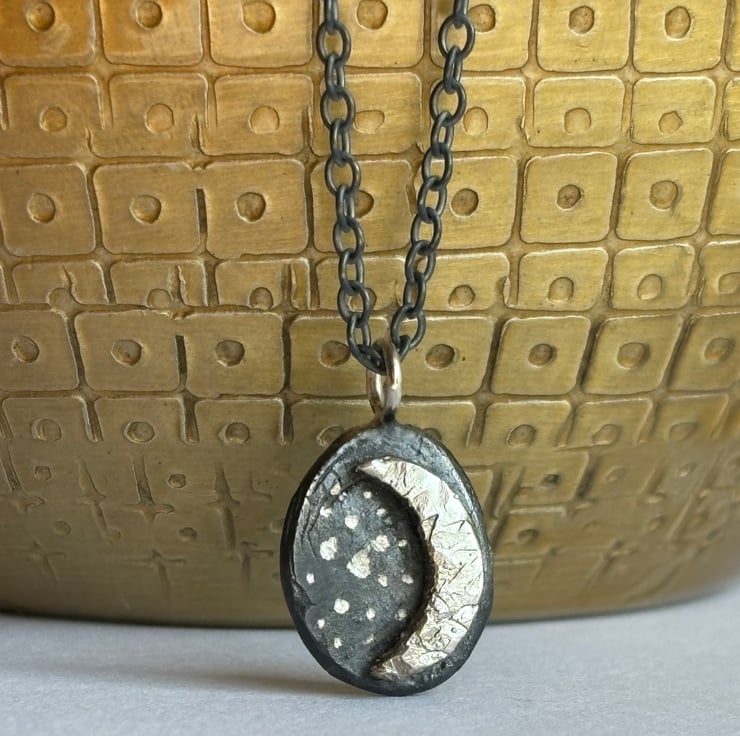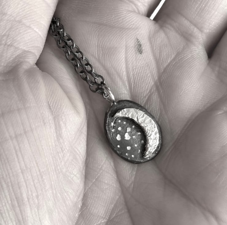 Perfect for the star gazer in your life this little necklace has been handcrafted from recycled sterling silver. Its oval textured shaped features a little crescent moon on one side and lots of little silver dots to represent the stars. The background is oxidised to a dark grey for contrast. This is hung from an 18 inch sterling silver chain which has been oxidised to a dark grey finish. Please note your pendant may vary very slightly from the image.