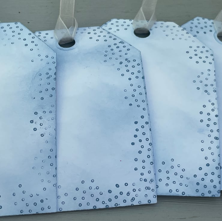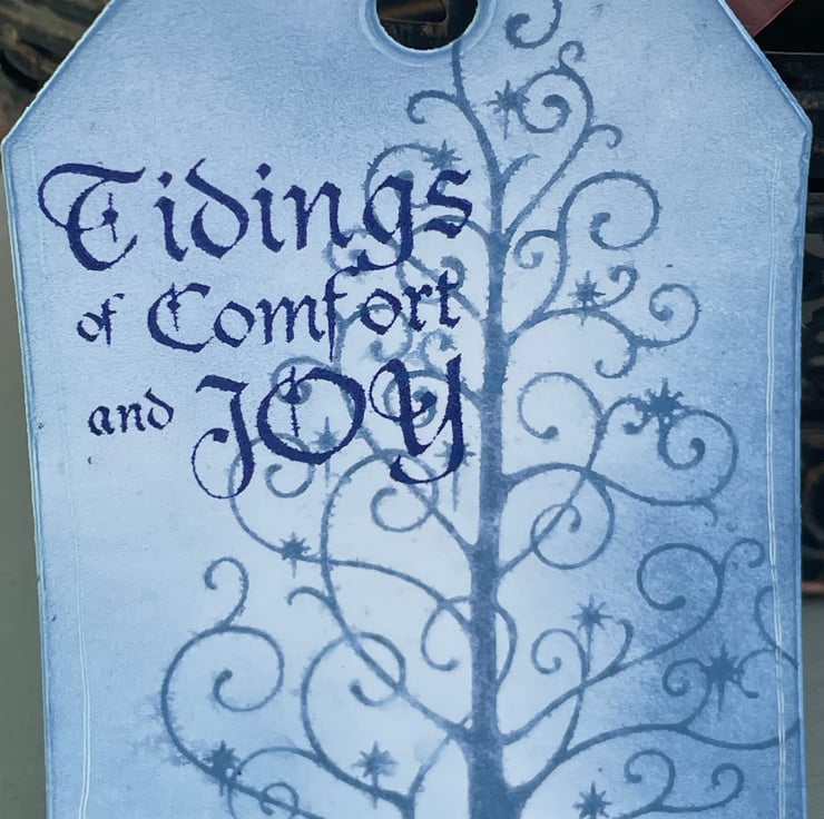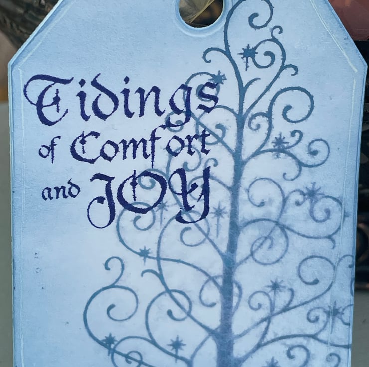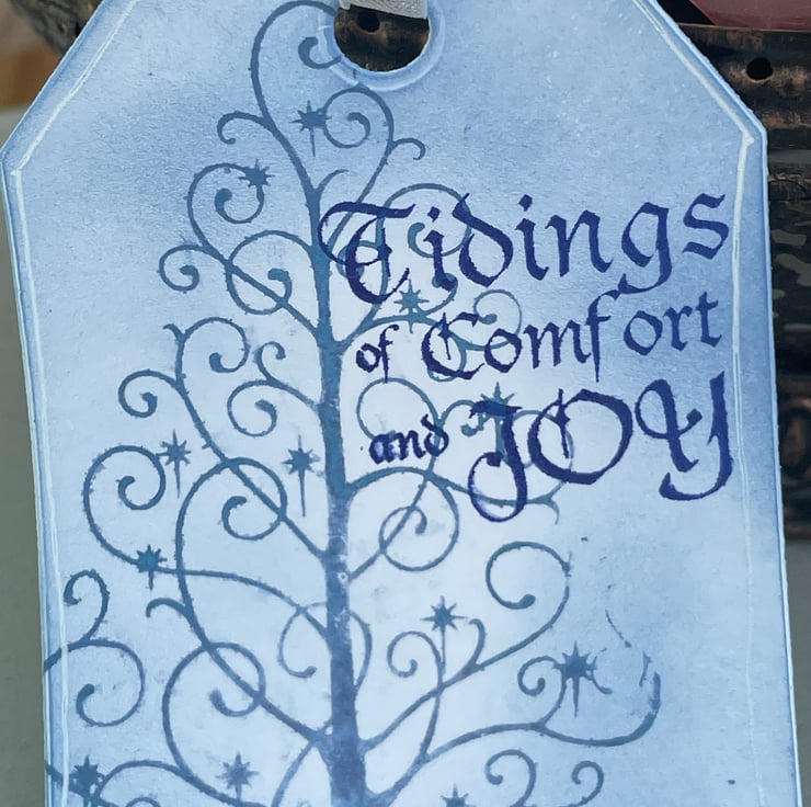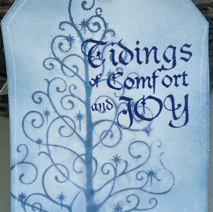 A beautiful set of 4 modern Christmas tags. These 9x6cm tags feature a modern swirl Christmas tree stamped in denim blue. They are then spritzed with water and allowed to bleed out to give a faded effect. The card was then inked with the same colour. There is a greeting stamped in a darker blue which says Tidings of comfort and joy. The back of the tags have a snowy border and are inked in a similar way. They all have an organza ribbon tie.