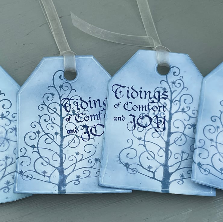 Set of 4 Christmas tree Tidings of comfort and joy gift tags