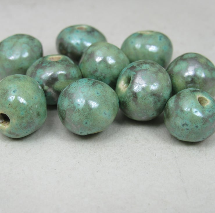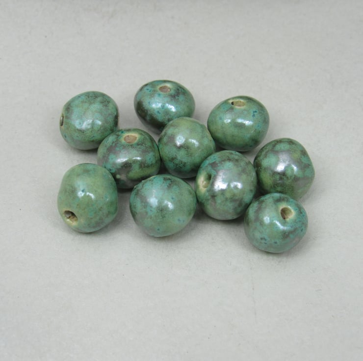 A mixture of handrolled ceramic beads, finished with a silver green, verdigris glaze