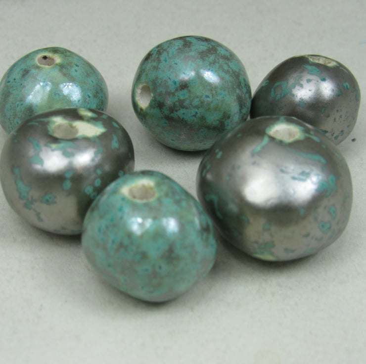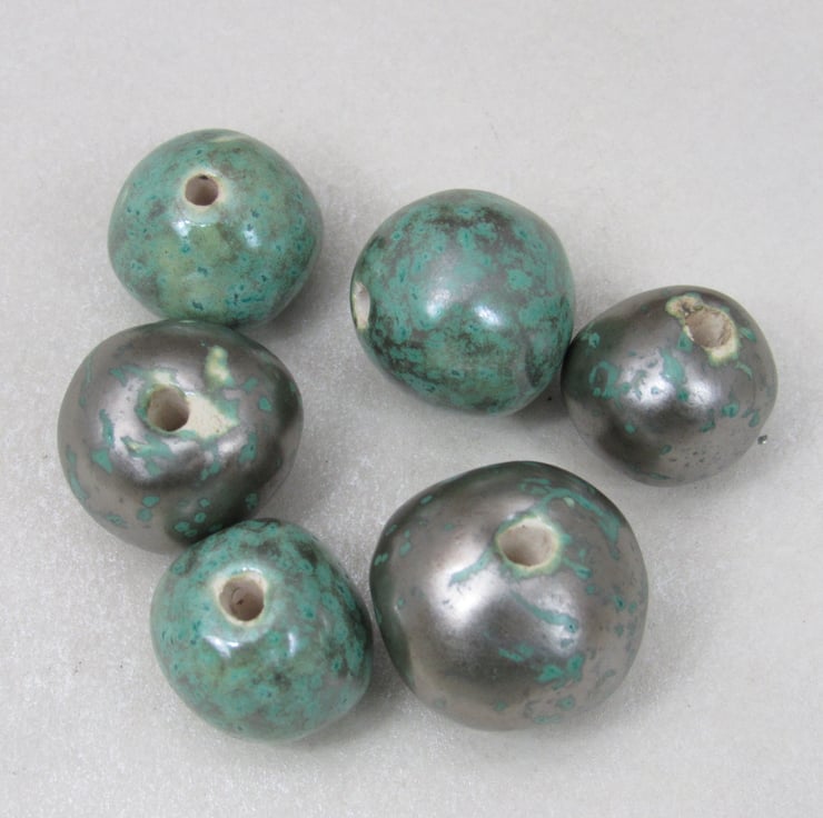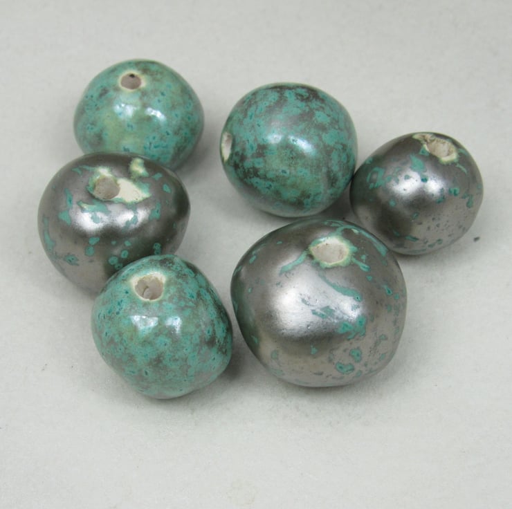 A mixture of handrolled ceramic beads, finished with a silver green, verdigris glaze