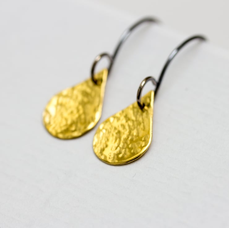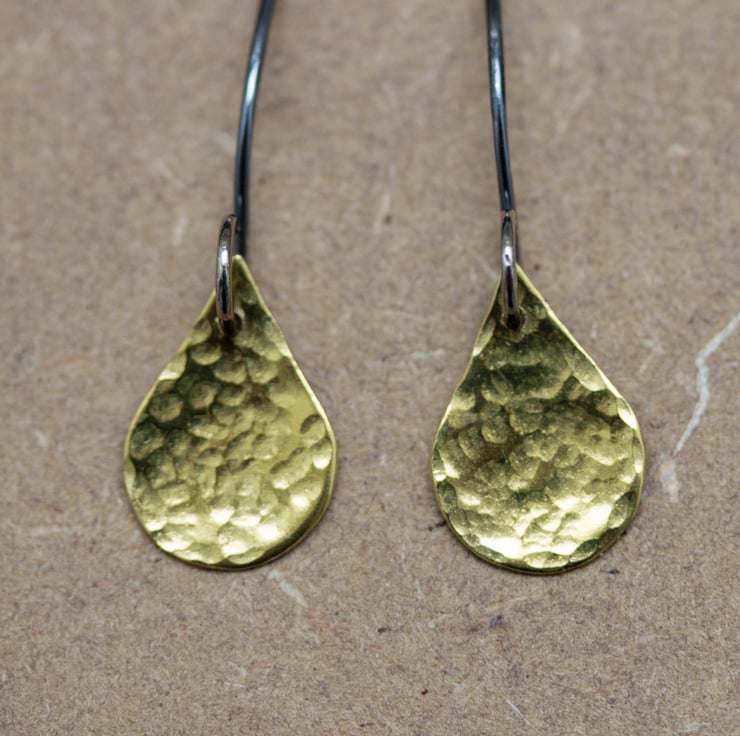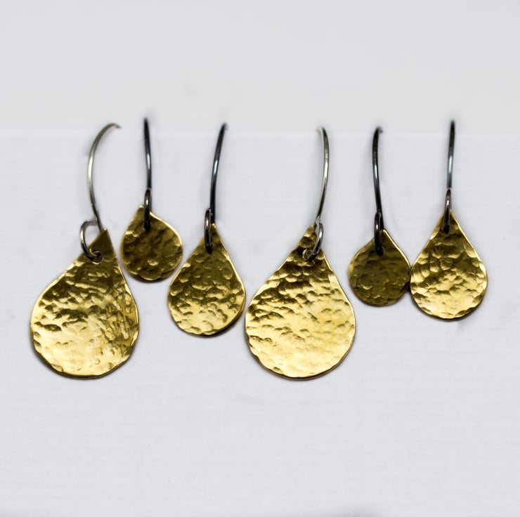 Medium sized 1.5cm hammered brass teardrops dangling from recycled sterling silver ear wires. Measuring 3.2cm from the top of the ear wire to the base of the teardrop the hammered brass catches the light beautifully.