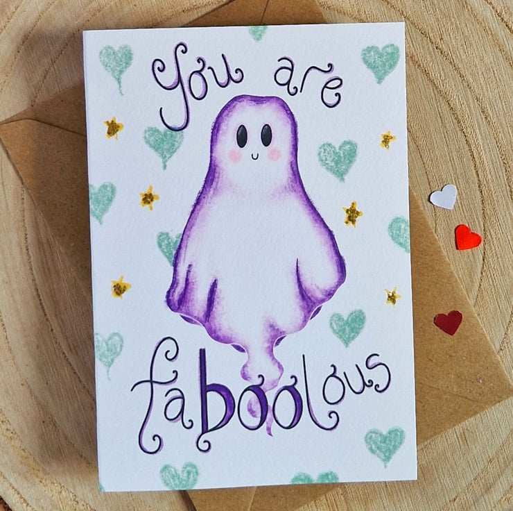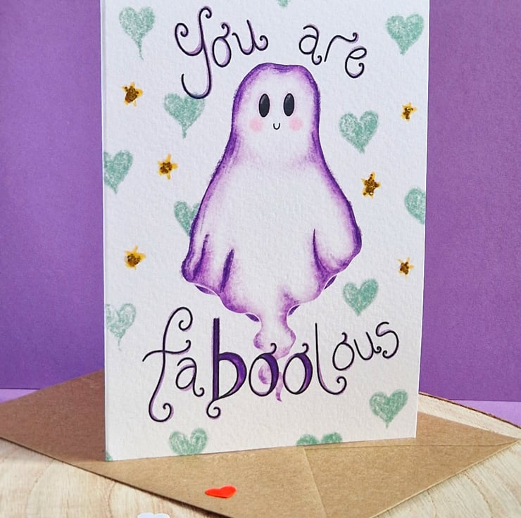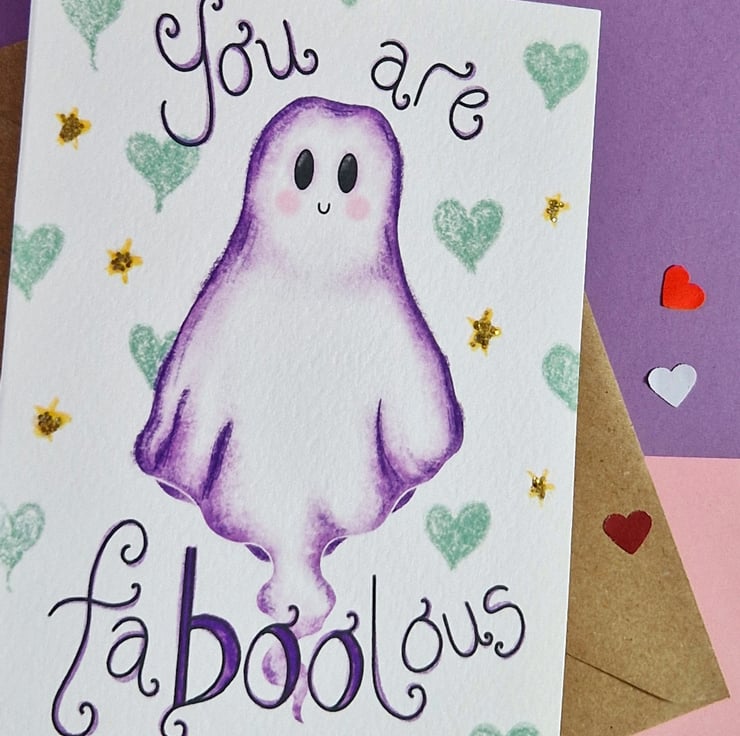 Tell someone how faBOOlous they are with this handmade greeting card! For a thank you, sharing a get well message or as a congratulations, this hand-drawn, A6 tectured card printed and glittered by hand is perfect for any occasion.
