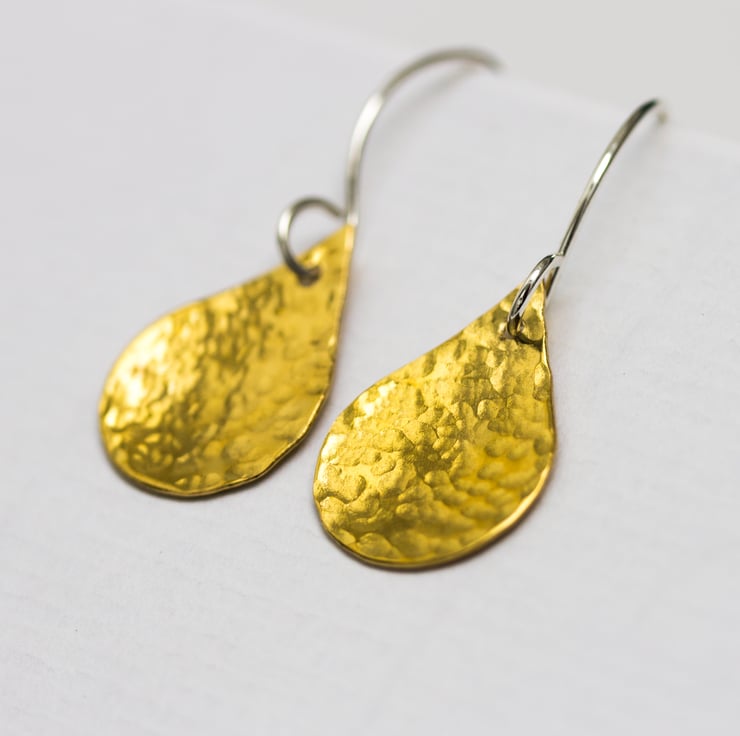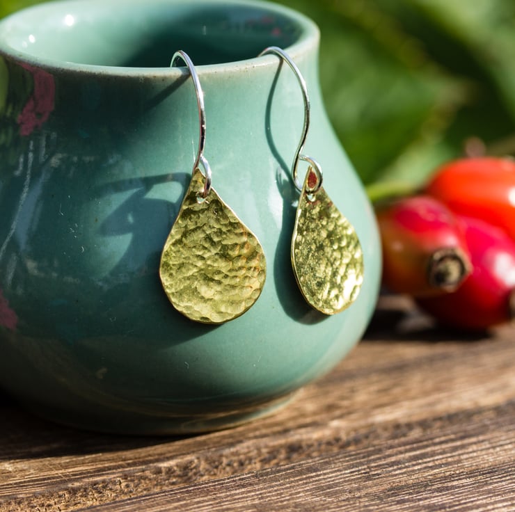Large 2cm hammered brass teardrops dangling from recycled sterling silver ear wires. Measuring 3.5cm from the top of the ear wire to the base of the teardrop the hammered brass catches the light beautifully.