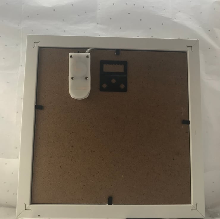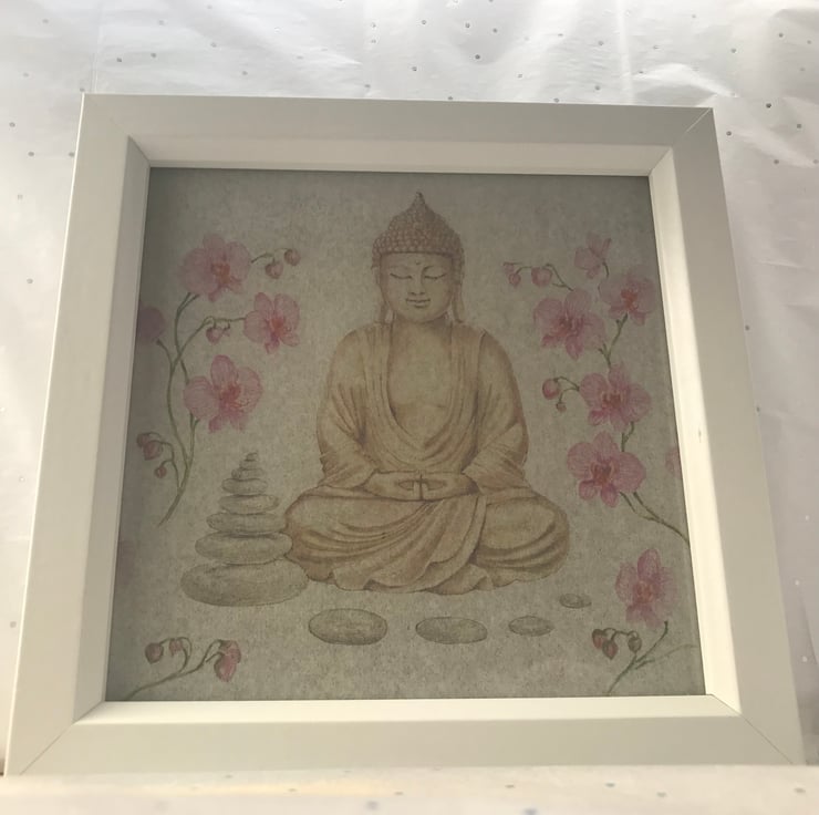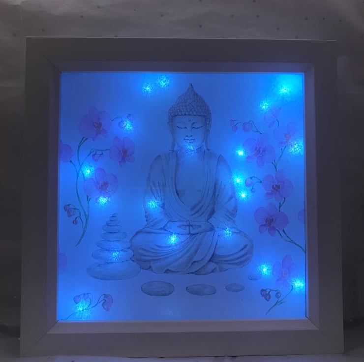A lovely buddha surrounded by orchids image in a shadow box frame with a background of LED lights, which look beautiful in a darkened room.