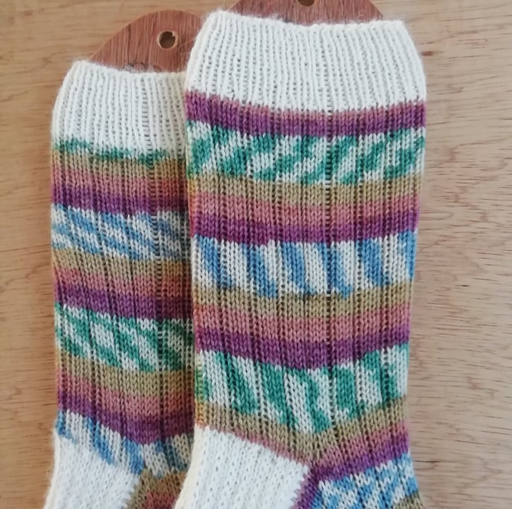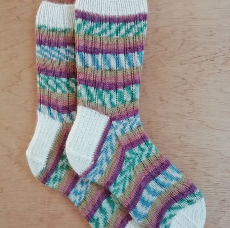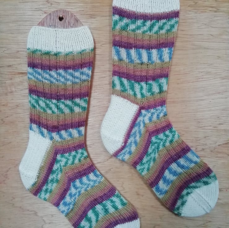 These socks are hand knitted using traditional methods on five double pointed needles. They are made using a beautiful 4 ply yarn comprising of 75% merino wool and 25% nylon, which helps to give the socks strength. The tops, heels and toes are knitted in a complimentary cream tone using a wool/alpaca blend.