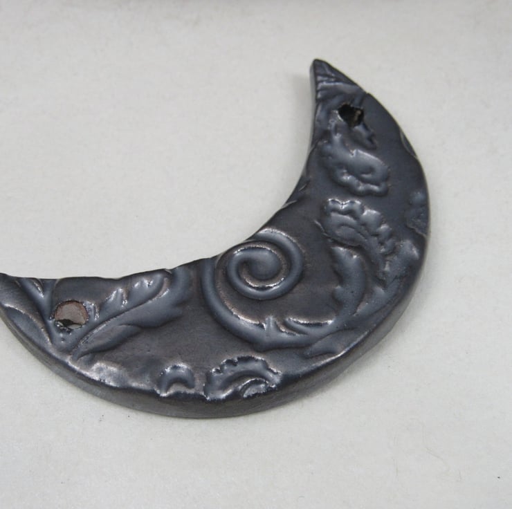 Metallic pewter glazed ceramic bib pendant patterned with textured leaves and flowers