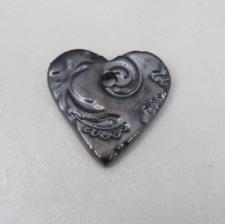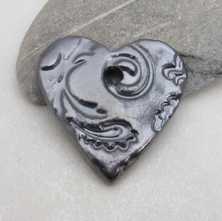 Medium heart shaped stoneware pendant, textured with a bold leaf and flower motif.