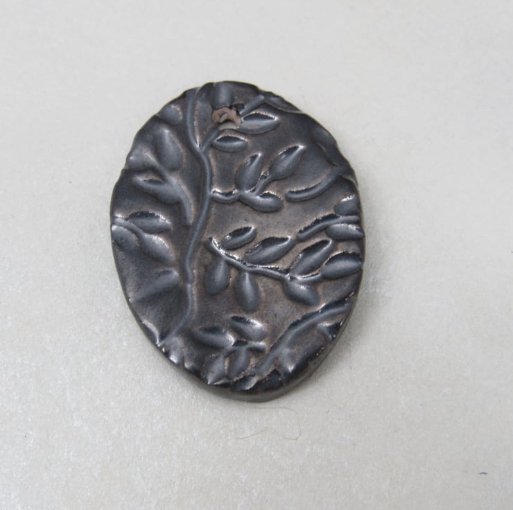 Large stoneware ceramic pendant, patterned with an embossed design of tiny leaves, and finished with a metallic pewter glaze.