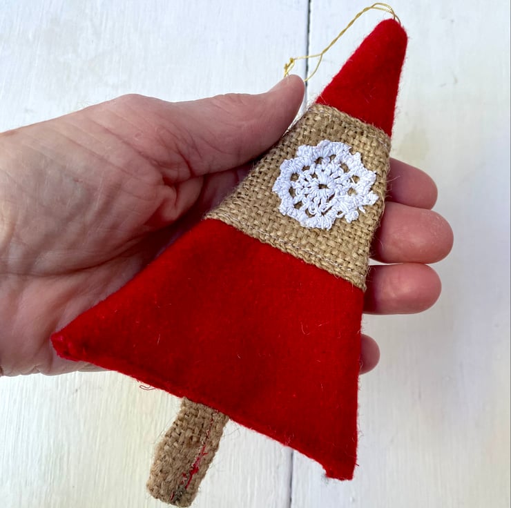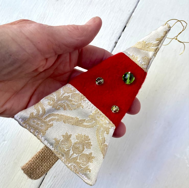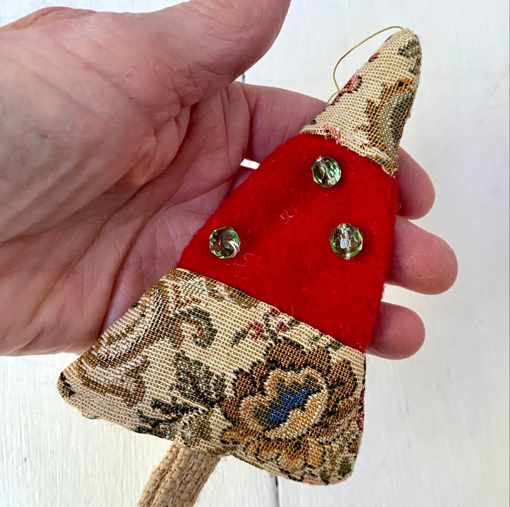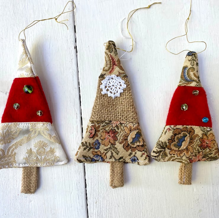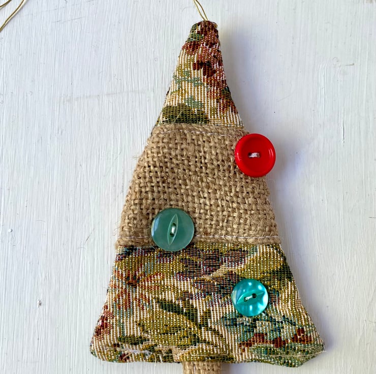 Made with vintage and repurposed fabrics, beads and buttons. These cute little trees are wonderful to hang on Christmas trees or anywhere in the house to bring some seasonal cheer. Being flat they are an ideal gift to add in with a card or present. These are Christmas decorations to use year after year.