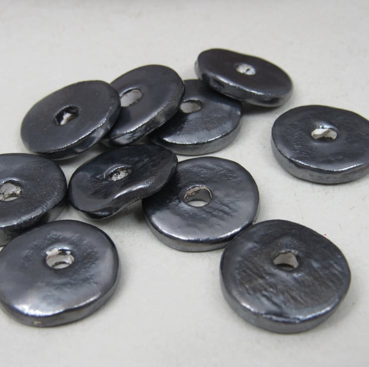 They are approx 1.8 cms (0.7") diameter, with a 3mm (0.1") hole but as they are handmade, they are not identical and not perfectly round.