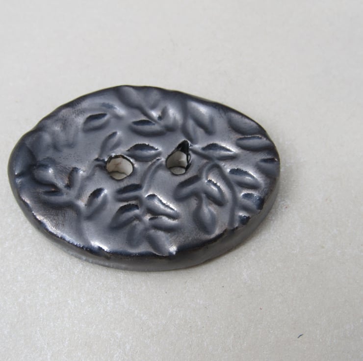 Medium oval shaped stoneware button, textured with a pretty motif of tiny leaves. Finished with a dark metallic pewter coloured glaze