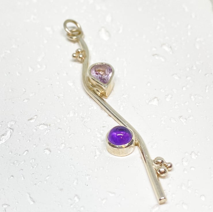 This silver vine pendant featuring two beautiful amethyst is a one of a kind piece. It has two natural amethyst, with the lightest colour being a rose du maroc.