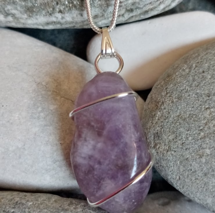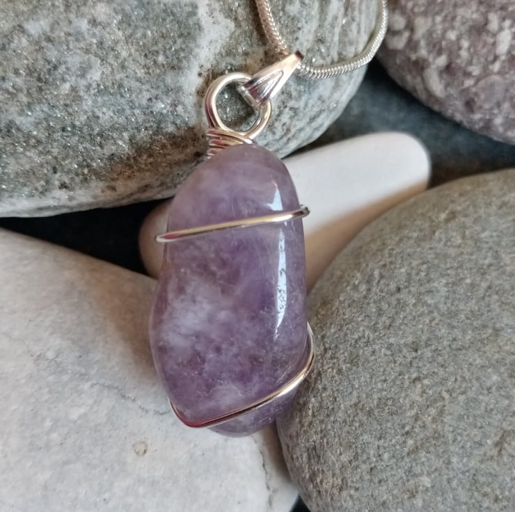 Wire wrapped natural amethyst tumble stone with silver plated snake chain.