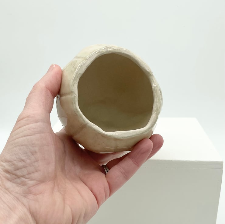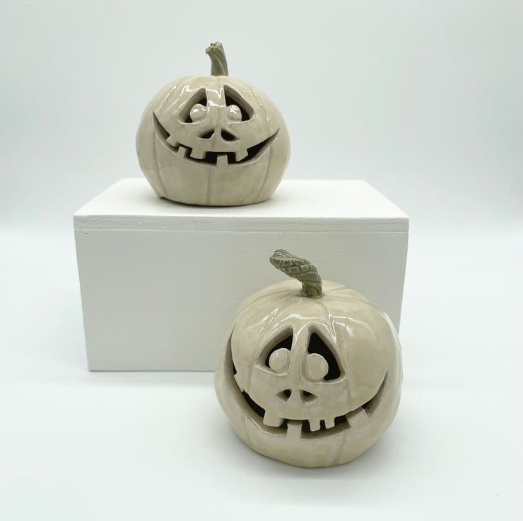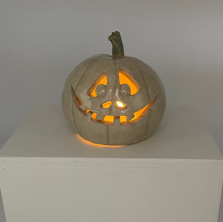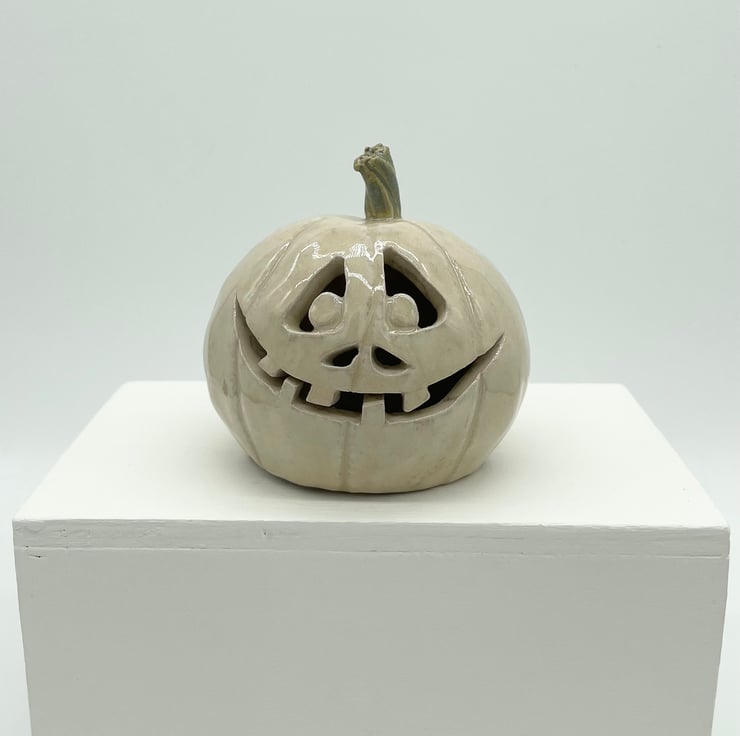 I’ve made this fun Halloween pumpkin from stoneware clay so it’s made to last and will give years of spooky pleasure. This happy character is finished with a stylish glossy cream glaze and green stalk, so it will sit in even the most sophisticated of interiors, lol.