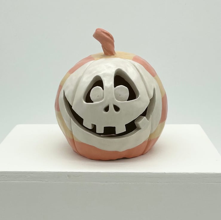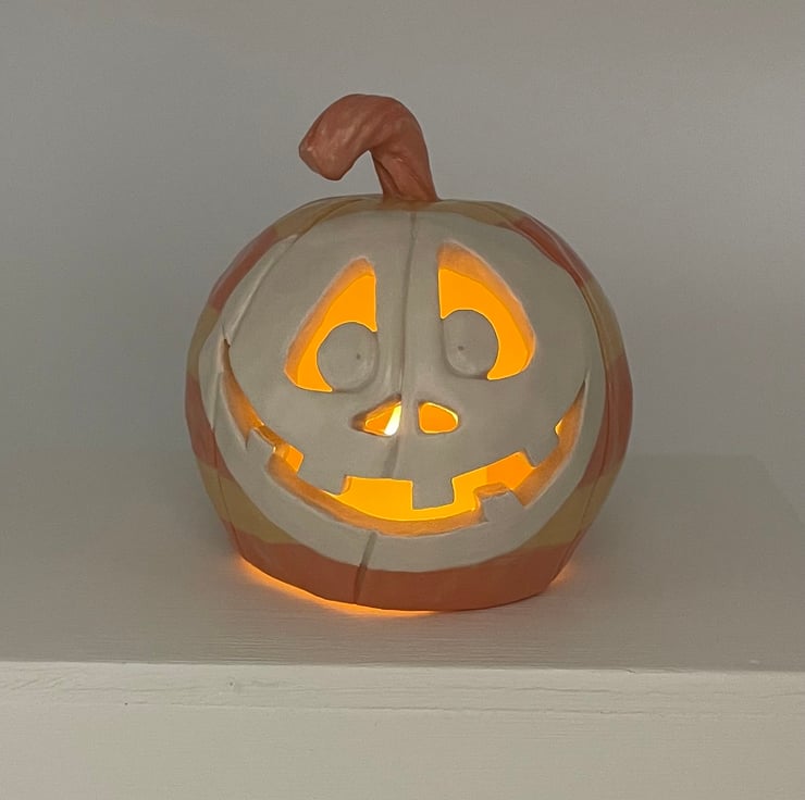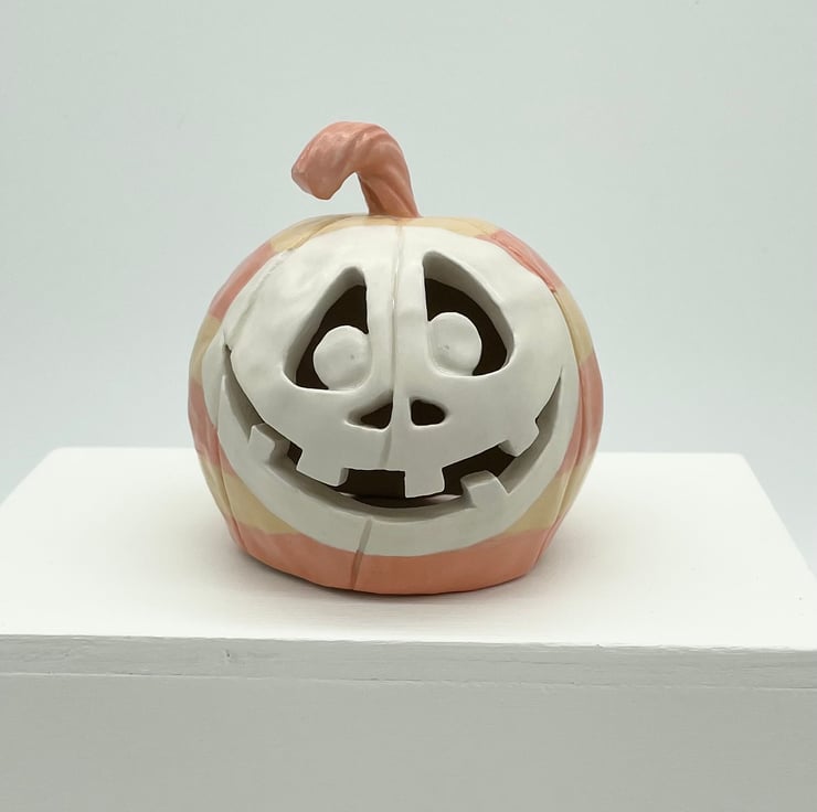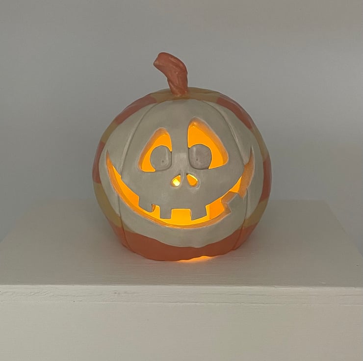 I’ve made this fun Halloween pumpkin from stoneware clay so it’s made to last and will give years of spooky pleasure. This happy character is all dressed up for Halloween in orange and yellow stripes, with a white face.