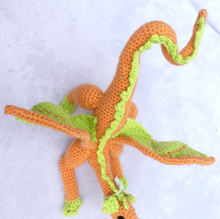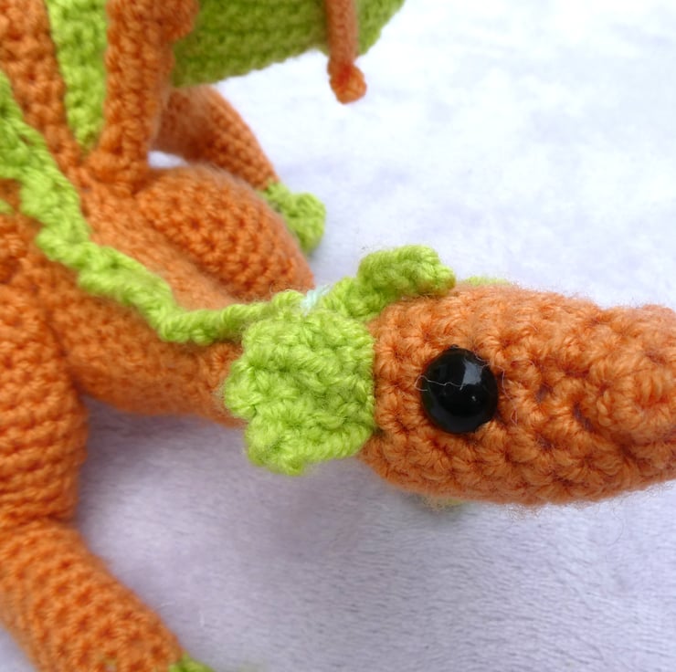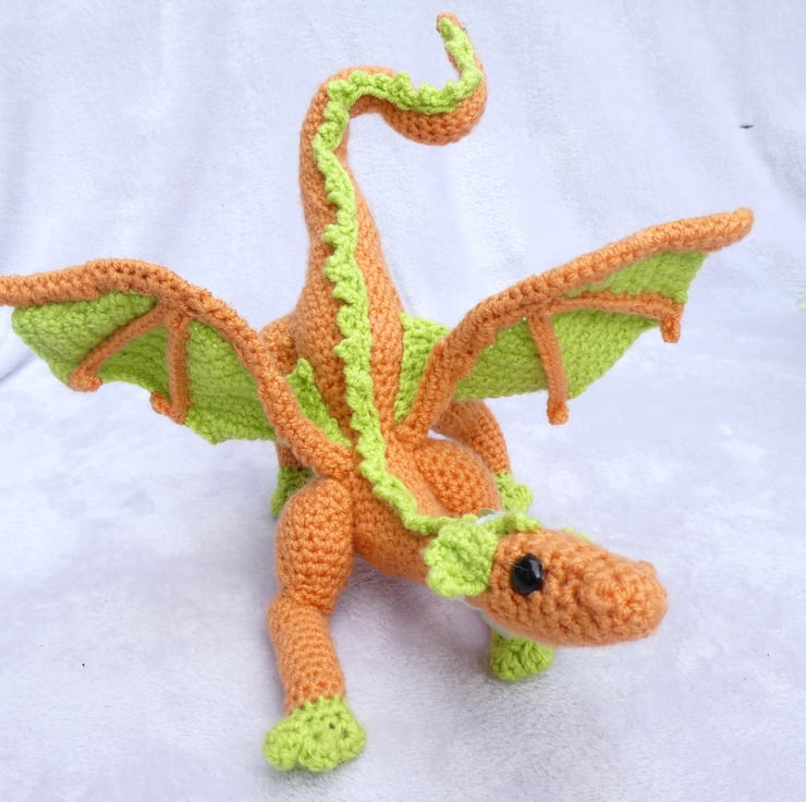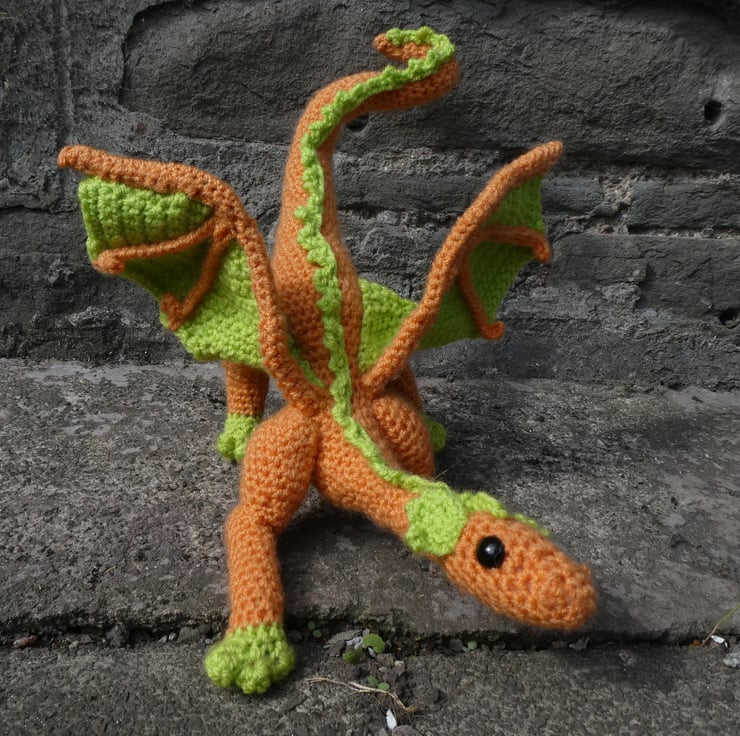 A playful young dragon doll, hand crocheted by a Scottish artist. They are posed in a 'playful dog' style, with an orange main colour and lime green details. Tail, neck and wings have wire to allow them to be pose able.