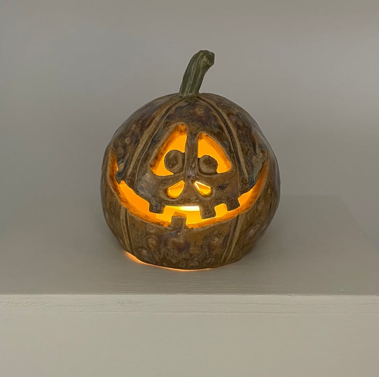 I’ve made this fun Halloween pumpkin from stoneware clay so it’s made to last and will give years of spooky pleasure. This happy character is glazed with a lovely mottled runny glaze in yellows, browns and even a touch of blue.