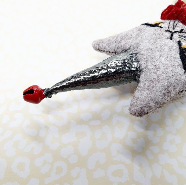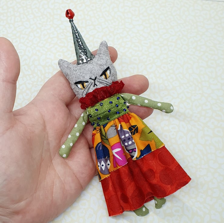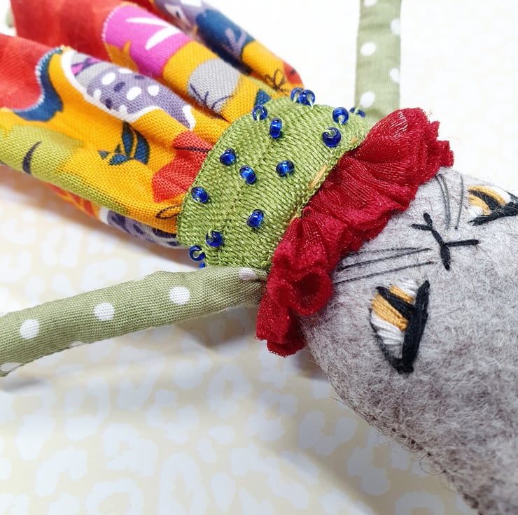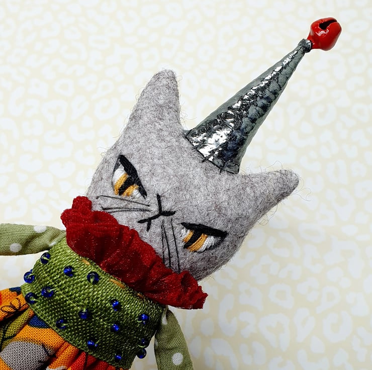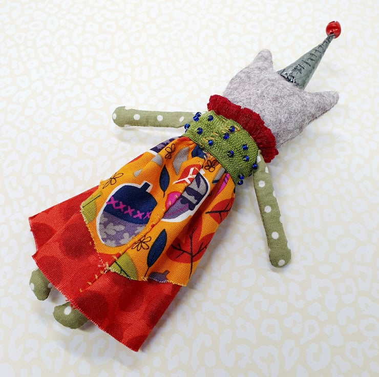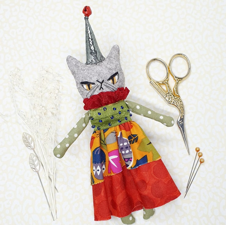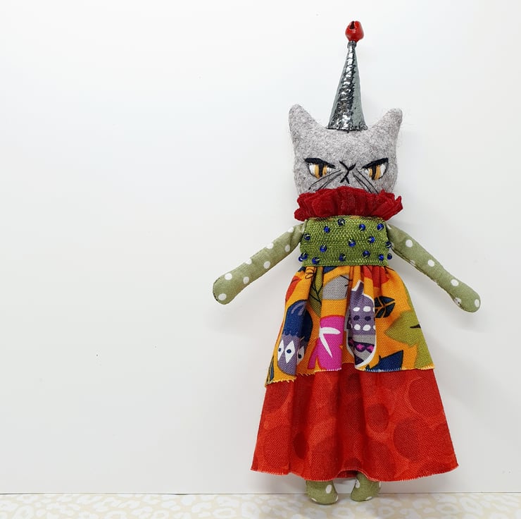 Decorative textile art doll with felt body and hand embroidered face. Betsy wears a hand stitched shiny party hat topped with a bell. This kitty wears a layered dress with beaded trim across the top and ruffled lace around the neck. Kitty measures roughly 18cm tall and can only stand if leaning against something. This is for decorative purposes only and not a toy. Sent in recyclable or recycled packaging.