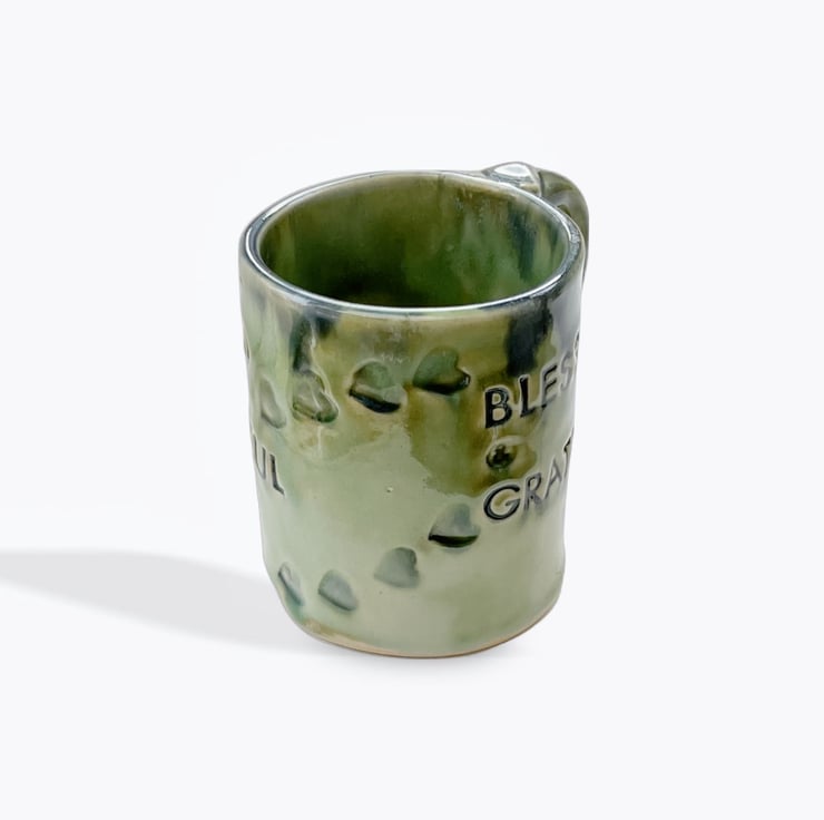 A beautiful handcrafted, hand-built mug with the words
