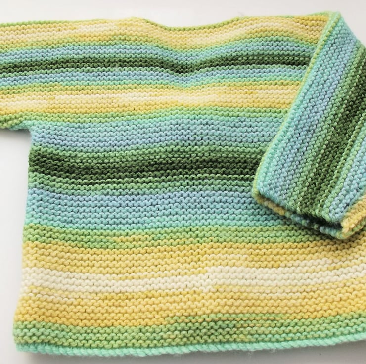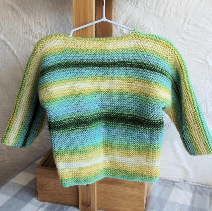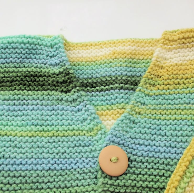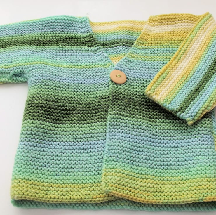 Hand knitted by me. Green and Mustard Babies Cardigan Jacket. V neck with 1 button closure. Knitted in medium weight acrylic blend yarn. hm35