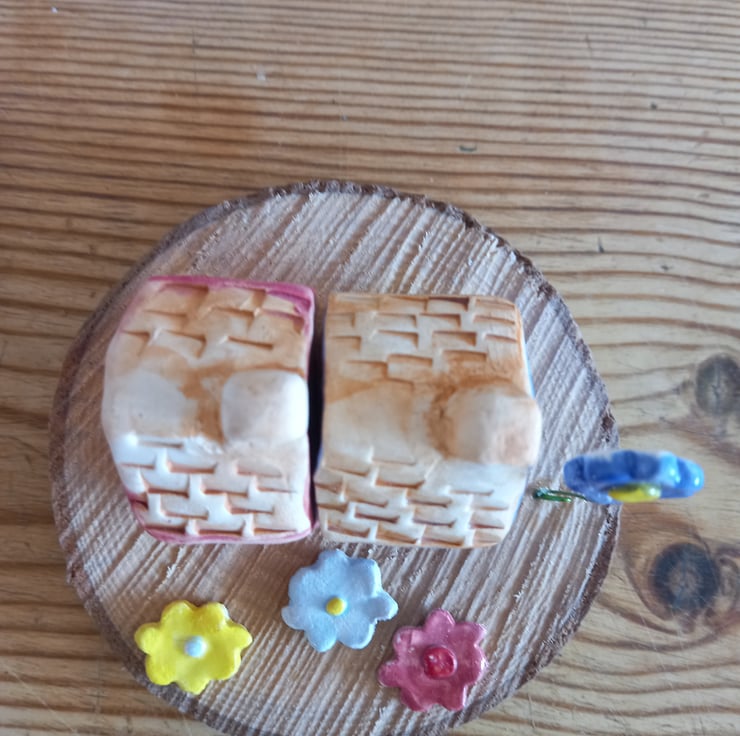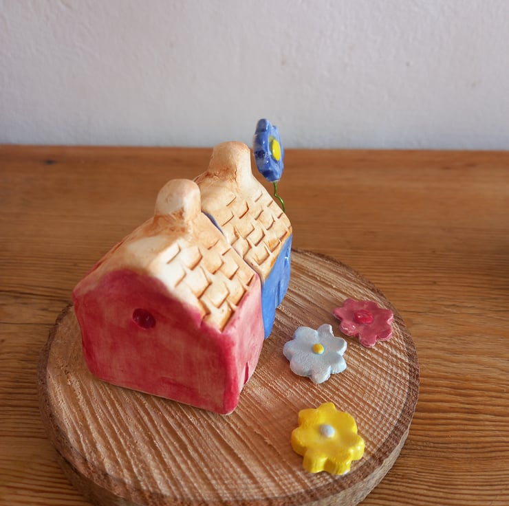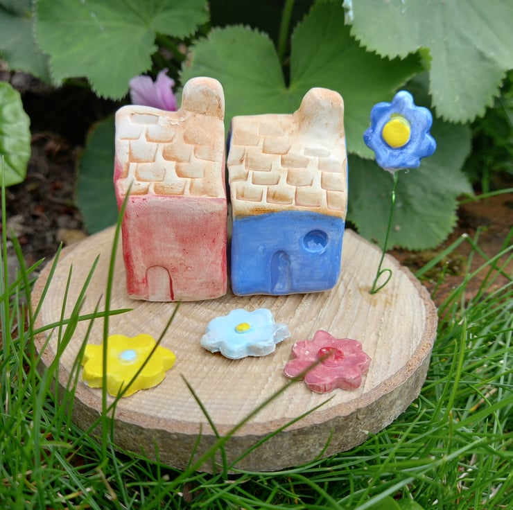 Two clay cottages affixed to a wood base with flowers made from clay and glazed in pretty colours.